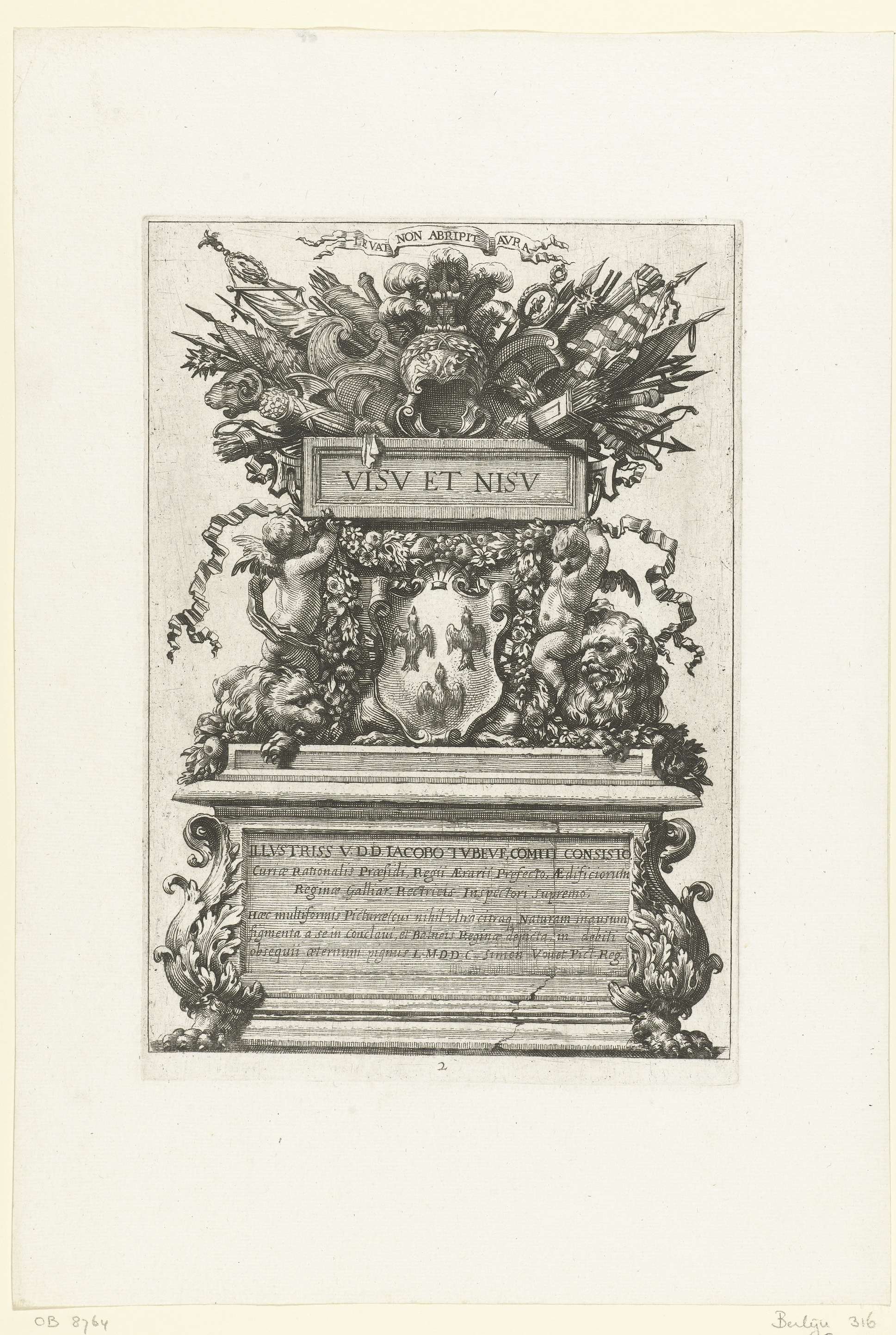 Op een voetstuk in de vorm van een tombe staan zes regels tekst. Erboven staat een wapenschild geflankeerd door twee putti die een tablet vasthouden met de tekst: VISV ET NISV. Bovenaan in een banderol: LEVAT NON ABRIPIT AVRA.