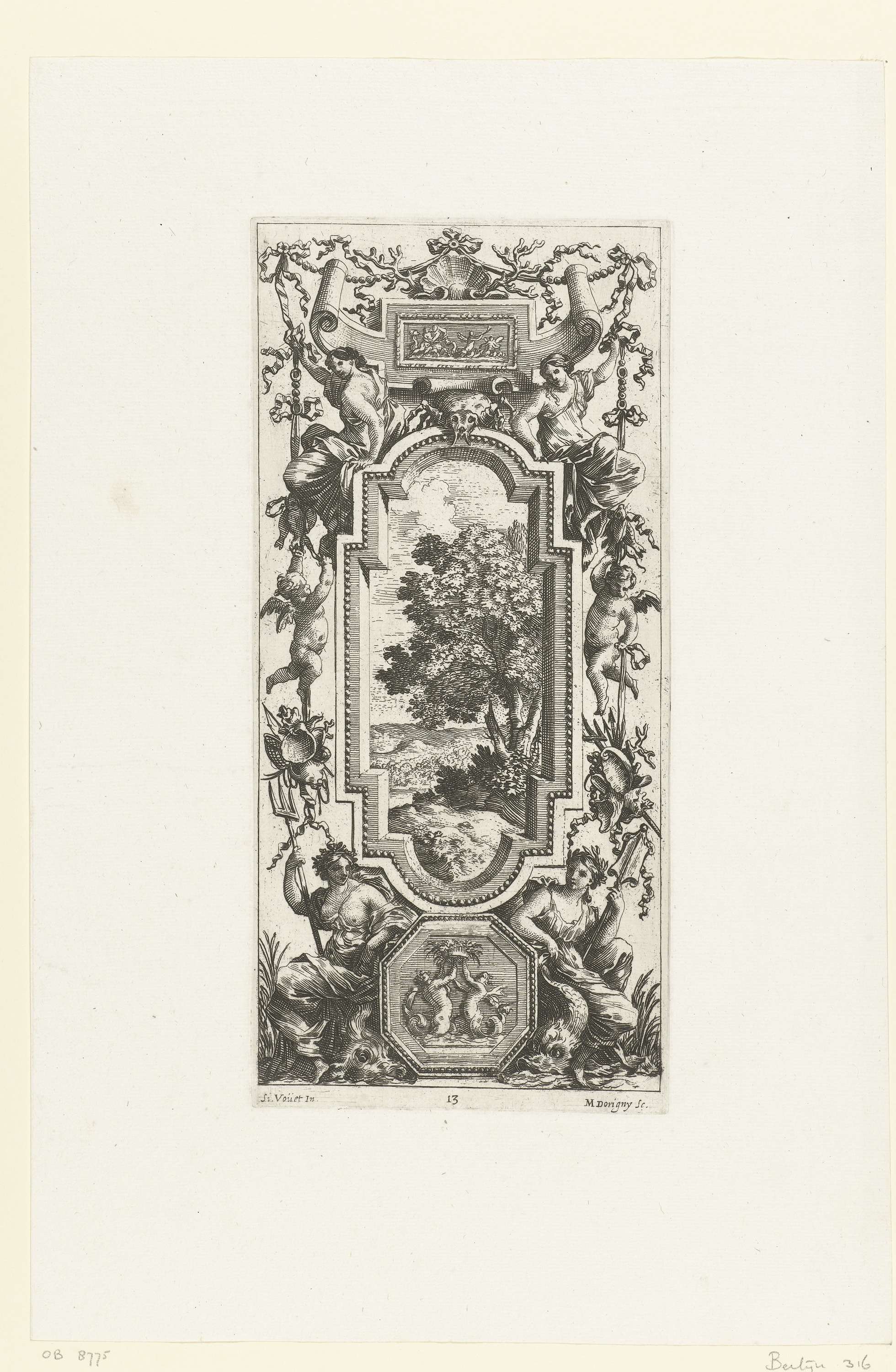 In de verticale lijst is een landschap te zien, in de kleinere lijst daaronder twee tritons die een mand optillen.