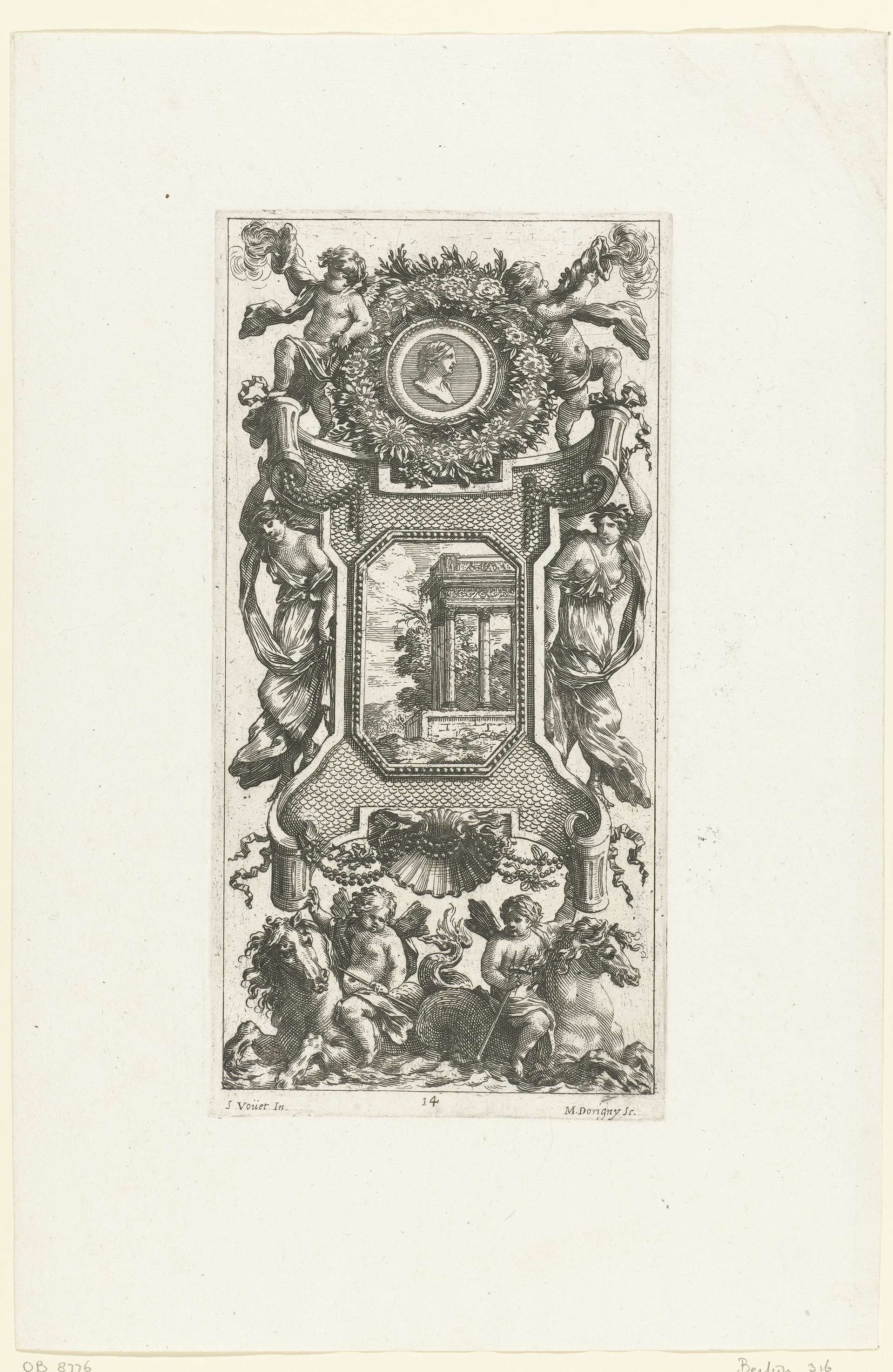 In het midden van de cartouche staat een lijst met een ruïne.