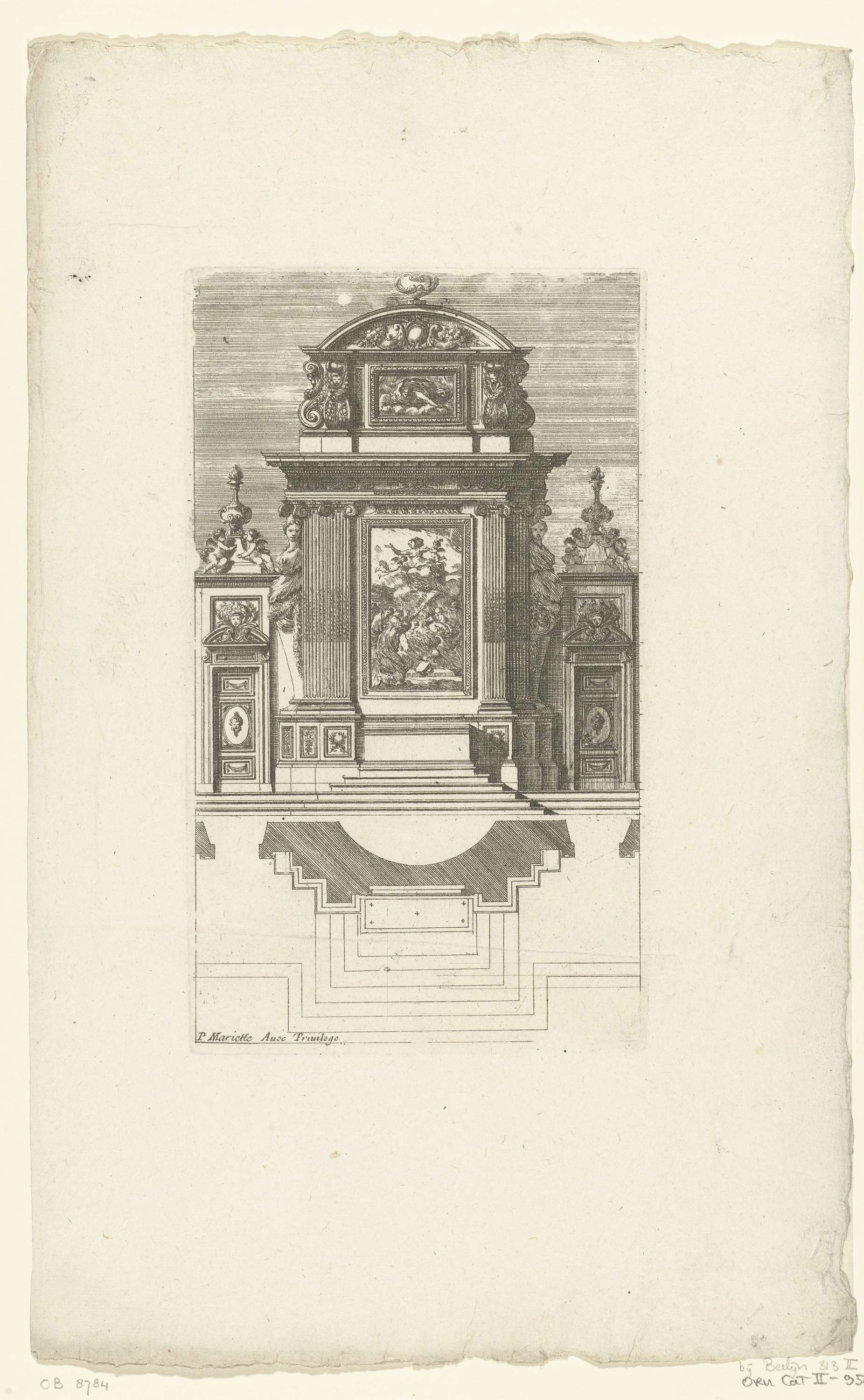 Altaar geflankeerd door twee gekoppelde Ionische pilasters, op het schilderij staat de hemelvaart van de Maagd. Met opstand en plan. Uit serie van 6 bladen, tweede editie.