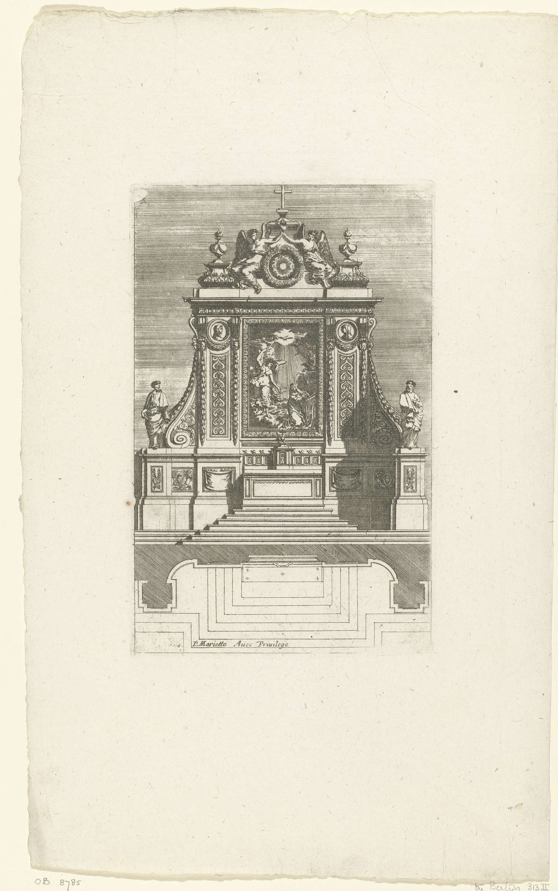 In het midden hangt een schilderij van de Annunciatie. Met opstand en plan. Uit serie van 6 bladen, tweede editie.