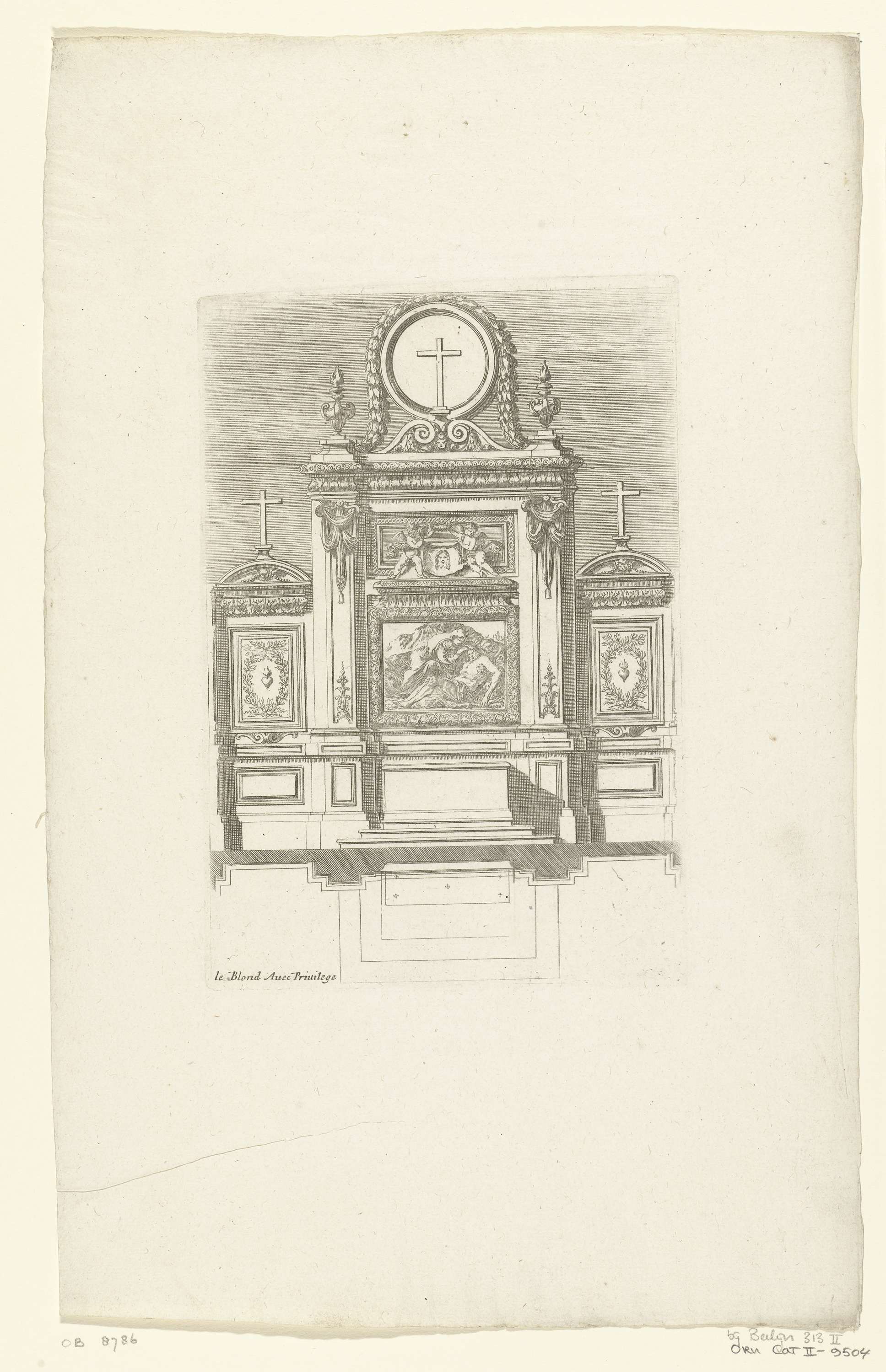 In het midden hangt een schilderij met een detail van de Kruisafneming. Met opstand en plan. Uit serie van 6 bladen, eerste editie.