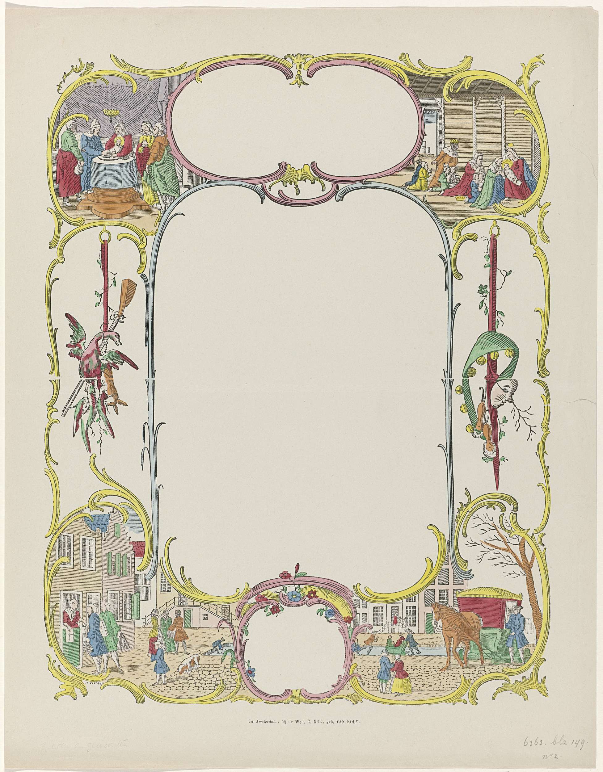 Wensbrief met onbeschreven cartouche binnen een decoratief kader met boven twee voorstellingen uit het leven van Christus en onder twee straatgezichten met wintervermaak. Ca. 1800-1850.