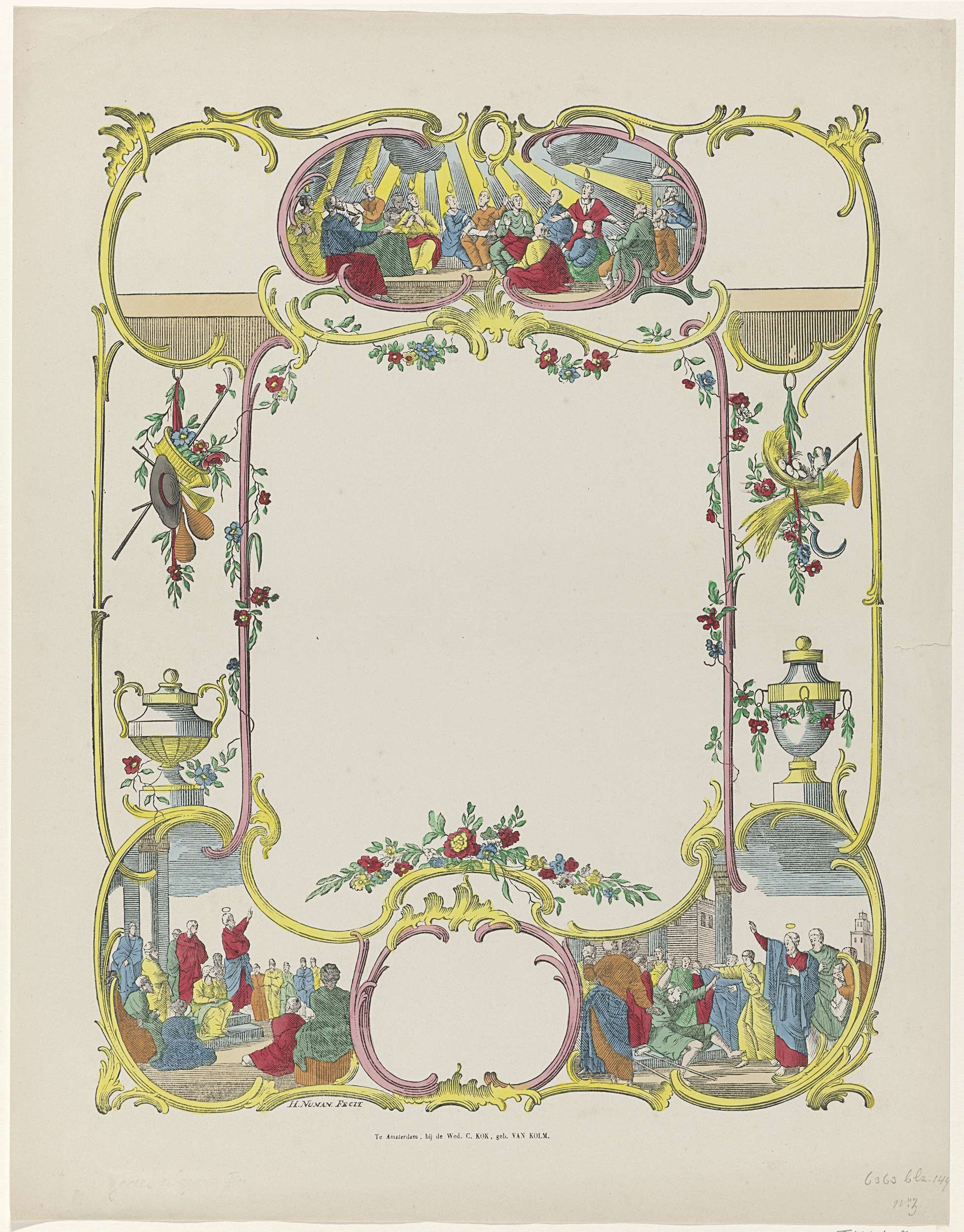 Wensbrief met onbeschreven cartouche binnen een decoratief kader met drie voorstellingen van Pinksteren en uit het leven van Christus. Ca. 1800-1850.