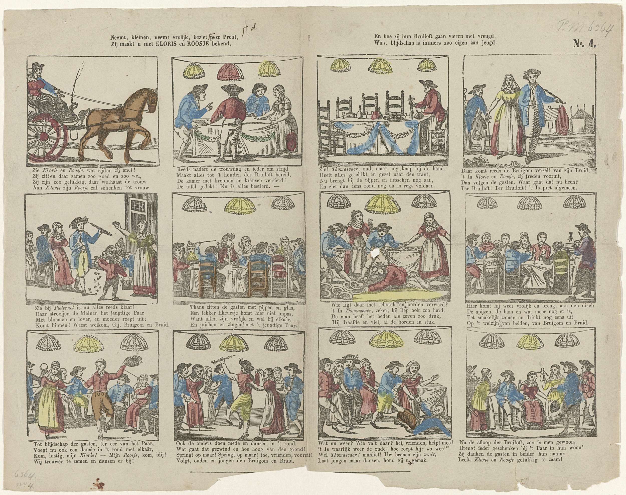 Blad met het verhaal van Kloris en Roosje in twaalf voorstellingen. Onder elk plaatje een vierregelig versje. Genummerd rechtsboven: No. 4. Ca. 1800-1850.