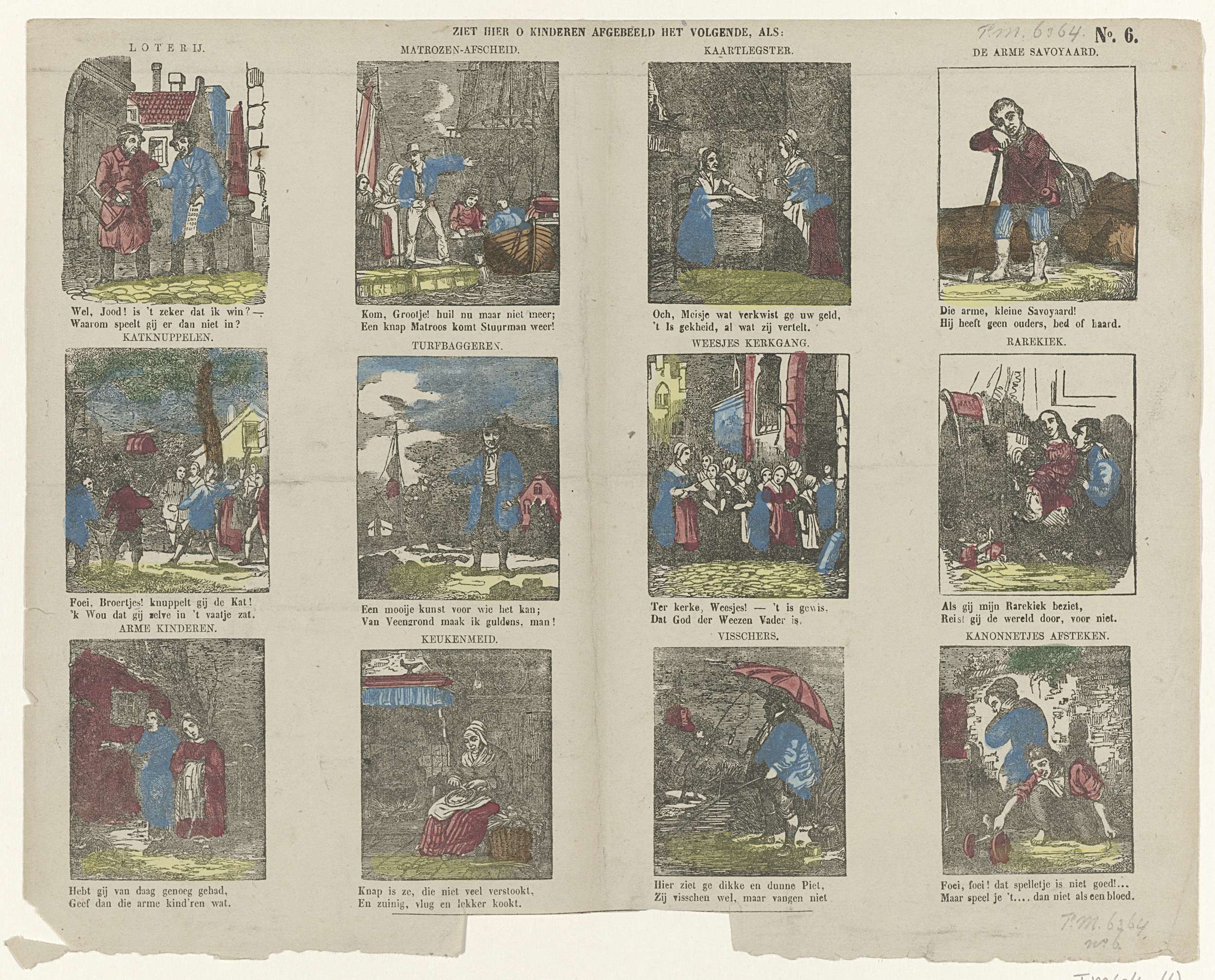 Blad met twaalf voorstellingen van verschillende vermaken, zoals beroepen, loterij, weeskinderen etc. Onder elk plaatje een tweeregelig versje. Genummerd rechtsboven: No. 6. Ca. 1800-1850.