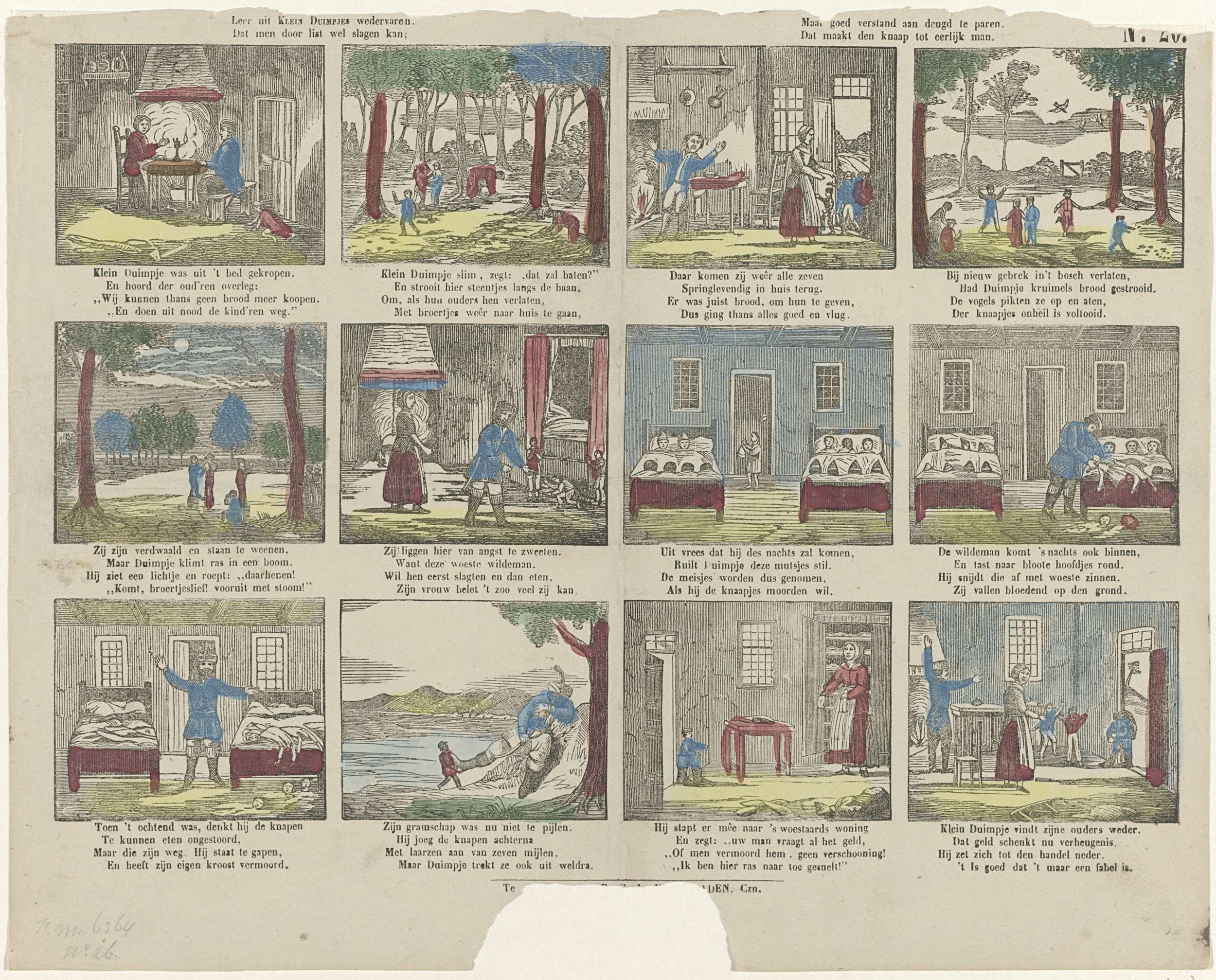 Blad met twaalf voorstellingen van het sprookje van Klein Duimpje. Onder elk plaatje een vierregelig versje. Genummerd rechtsboven: No. 26. Ca. 1800-1850.