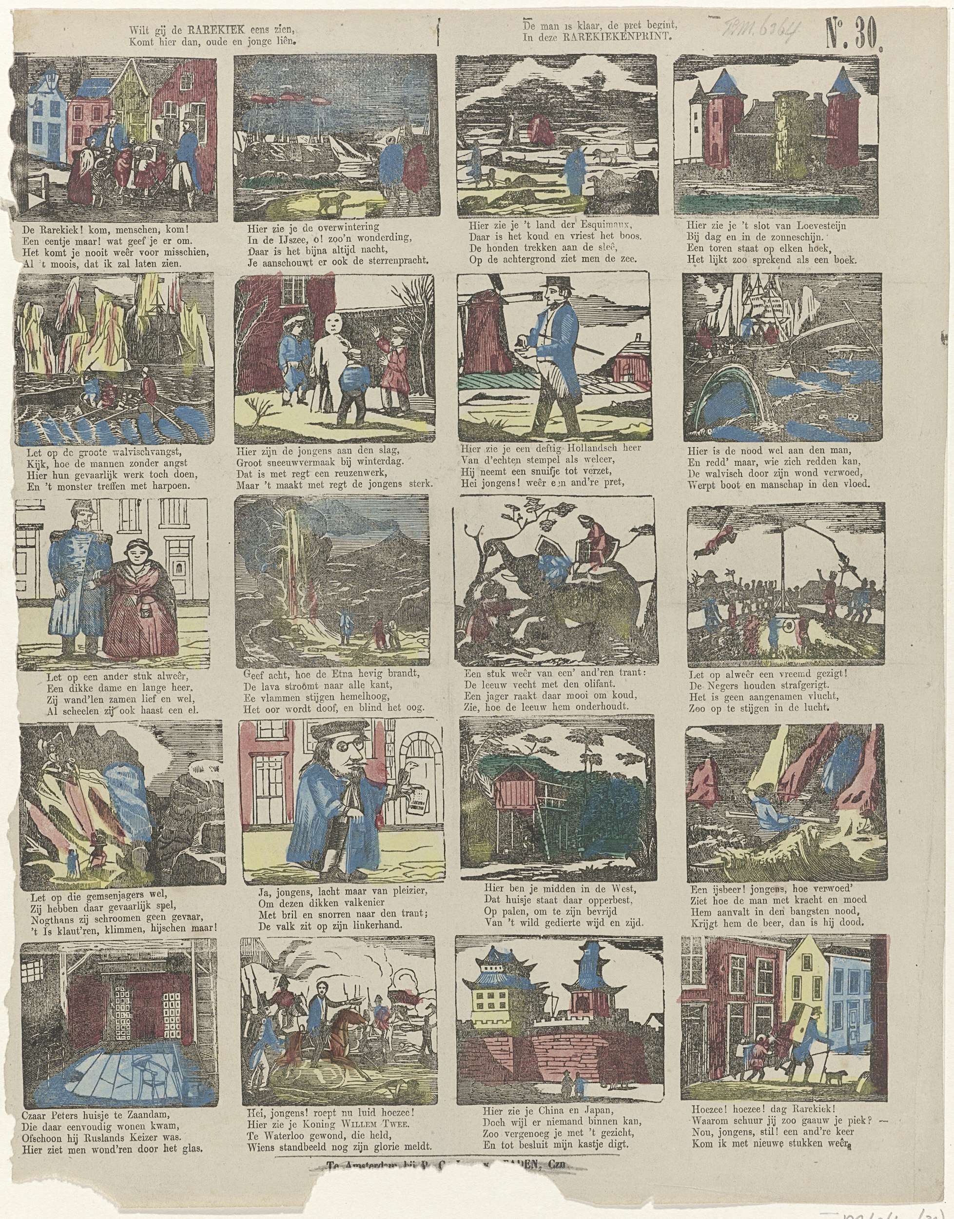 Blad met twintig voorstellingen vertoond door de rarekiek. Het eerste en het laatste plaatje tonen het begin en het einde van de voorstelling. Onder elk plaatje een vierregelig versje. Genummerd rechtsboven: No. 30. Ca. 1800-1850.