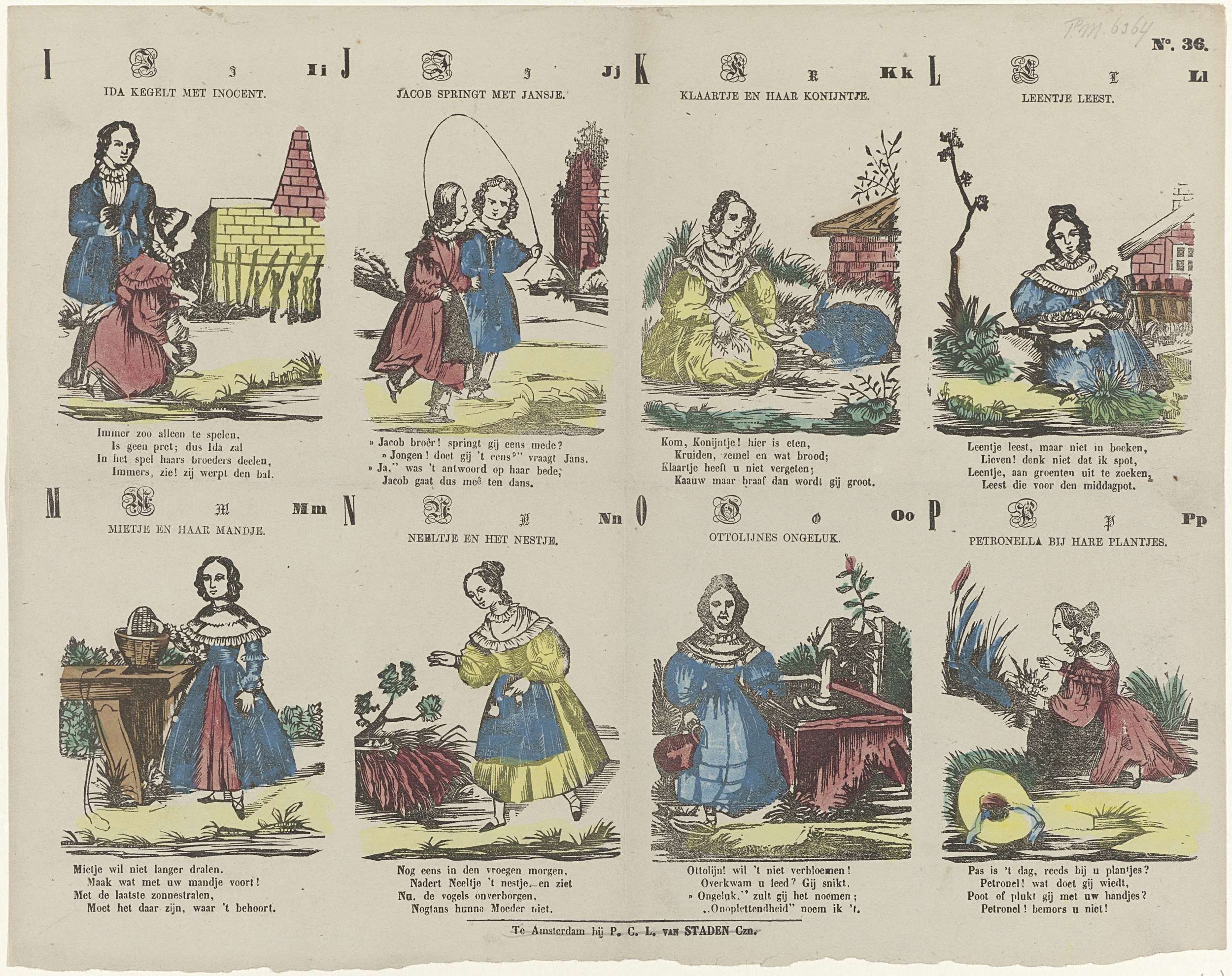 Blad met acht voorstellingen uit een ABC van het meisjesleven, voor de letters I-P, bij elk letter een meisjesnaam. Onder elk plaatje een vierregelig versje. Genummerd rechtsboven: No. 36. Ca. 1800-1850.
