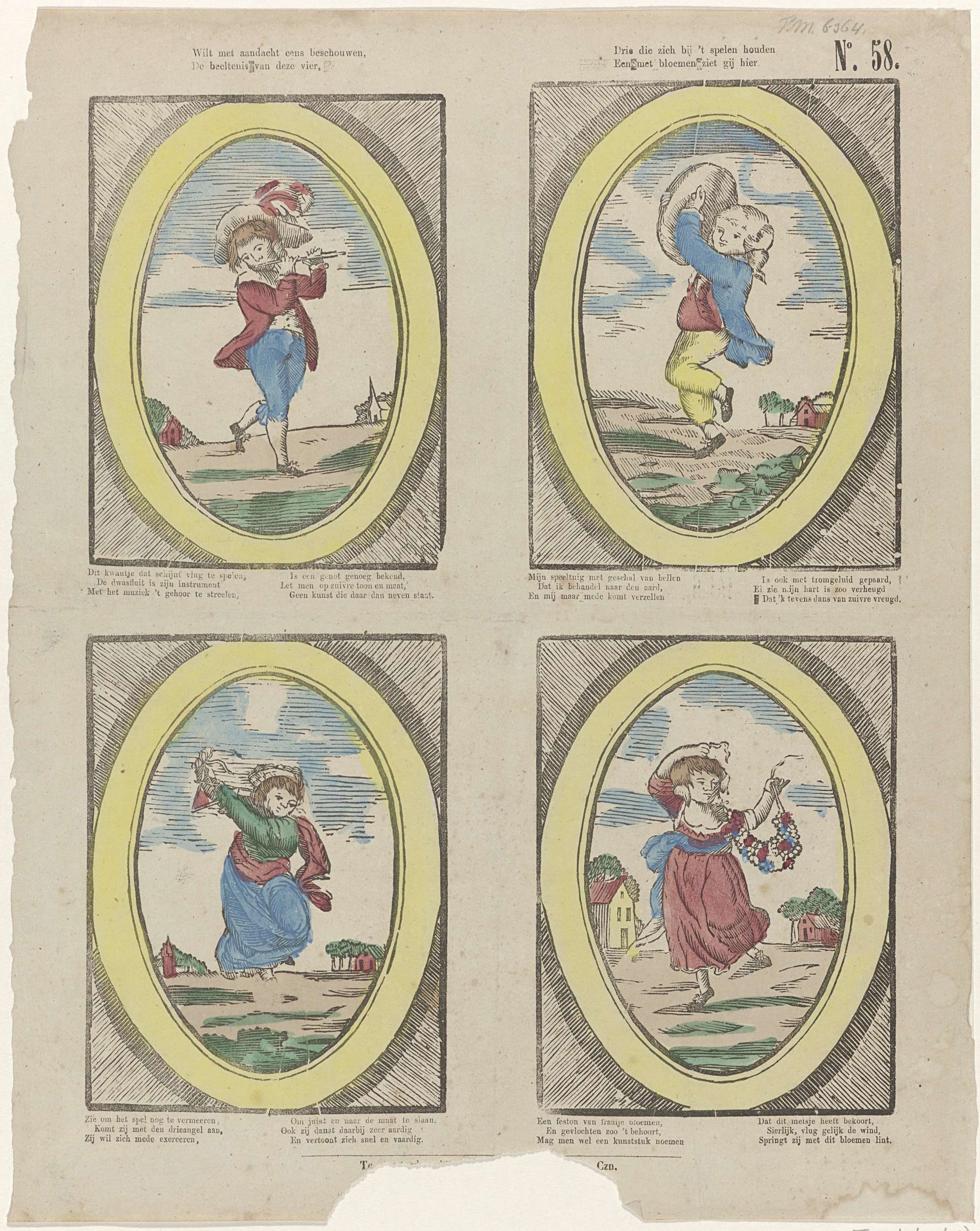 Blad met vier voorstellingen van kinderspelen. Elk plaatje in een ovaal met twee driergelige versjes. Genummerd rechtsboven: No. 58. Ca. 1800-1850.