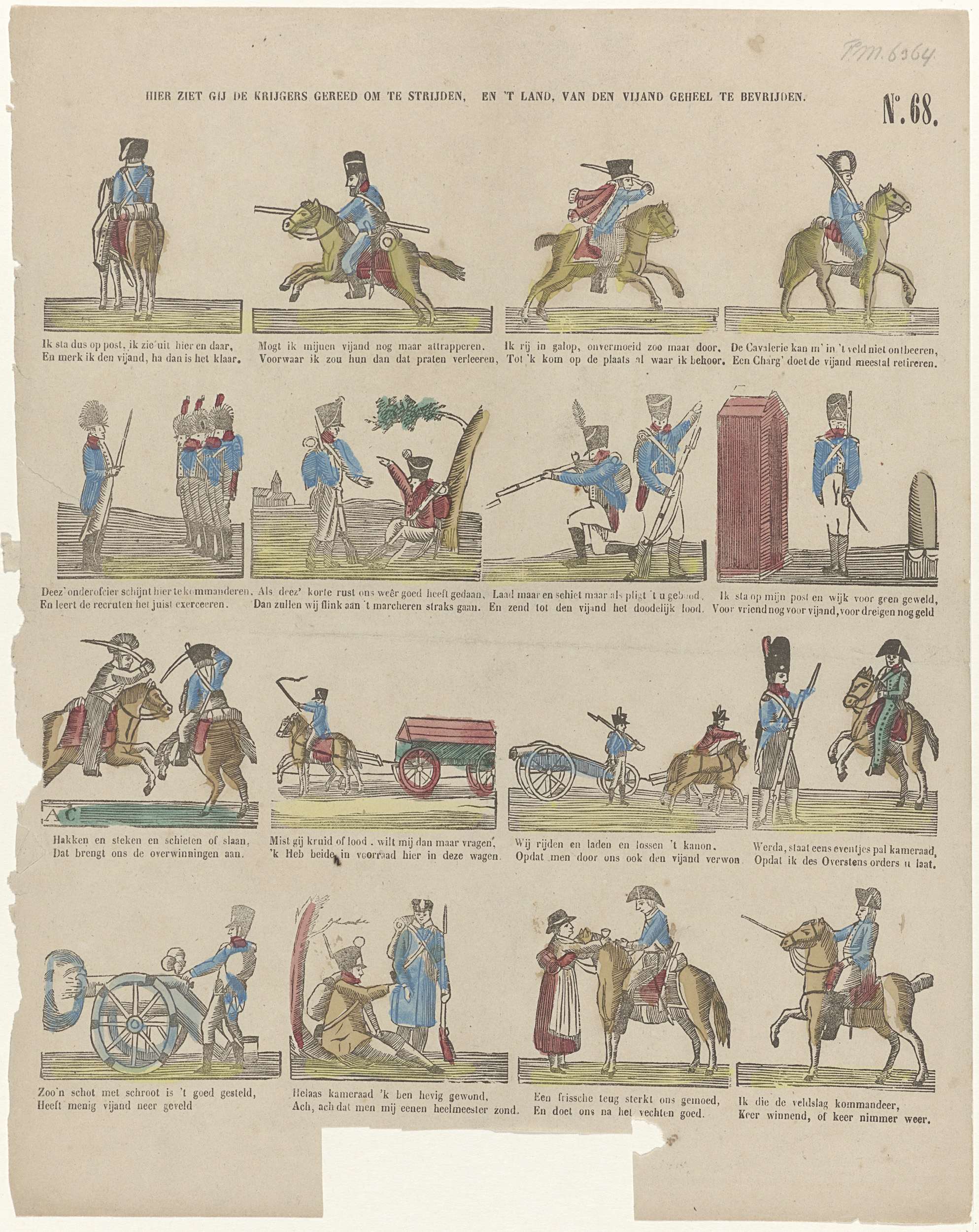 Blad met zestien voorstellingen van militairen. Onder elk plaatje een tweeregelig versje. Genummerd rechtsboven: No. 68. Ca. 1800-1850.