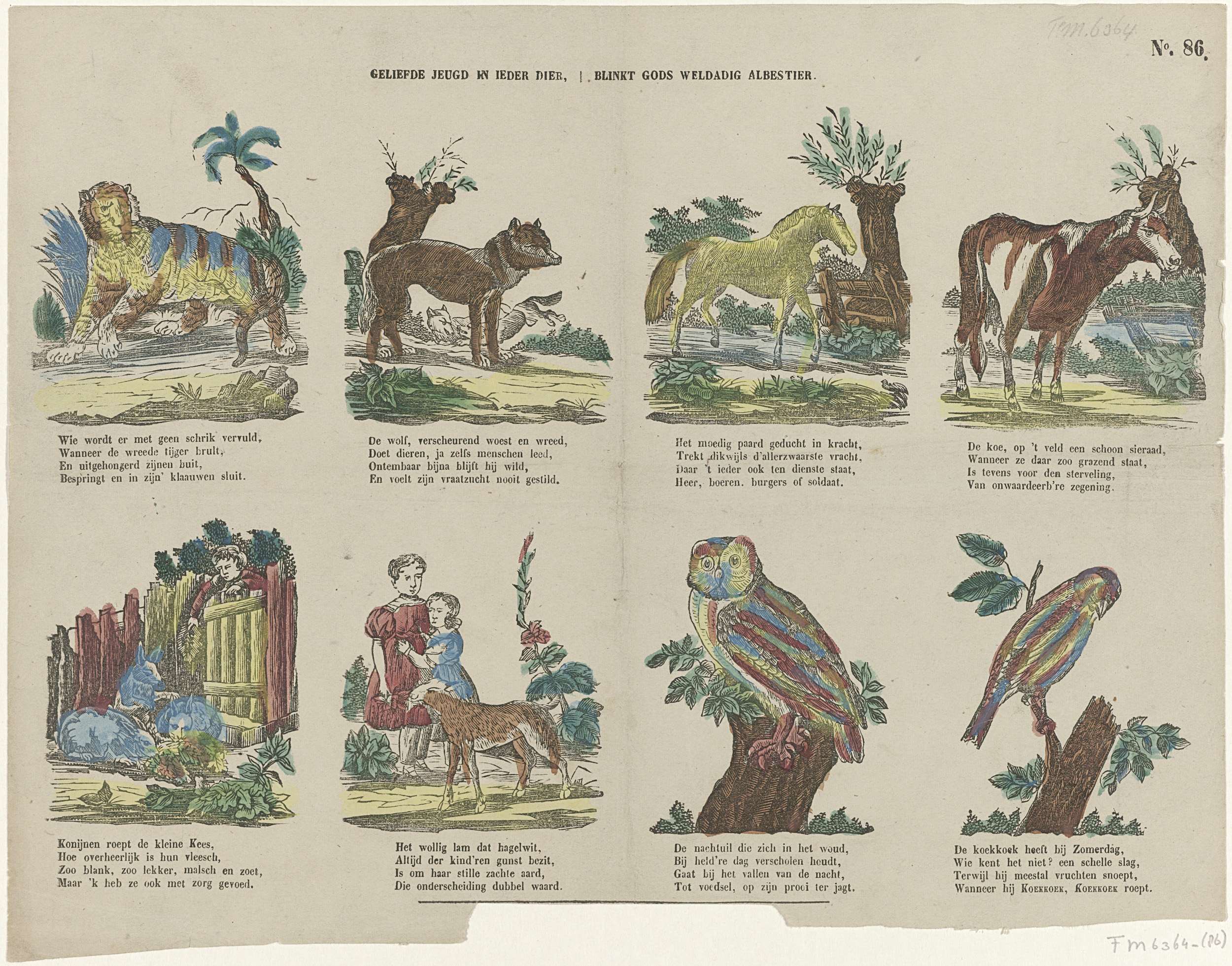 Blad met acht voorstellingen van dieren. Onder elk plaatje een vierregelig versje. Genummerd rechtsboven: No. 86. Ca. 1800-1850.