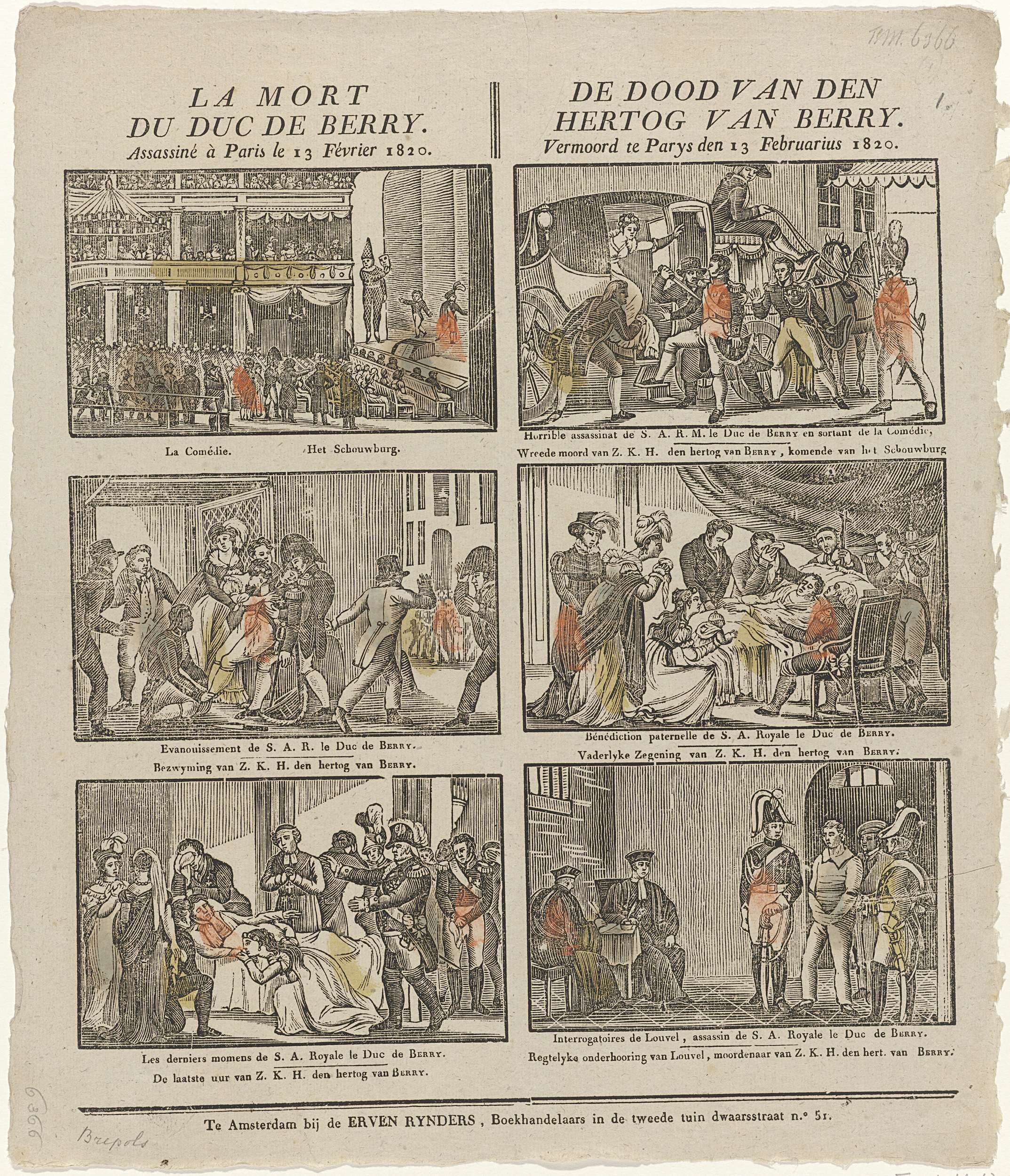 Blad met zes voorstellingen van de moordaanslag op de Karel Ferdinand, hertog van Berry, te Parijs op 13 februari 1820. Onder elk plaatje een onderschrift in het Frans en Nederlands. Ongenummerd. Ca. 1830-1855.