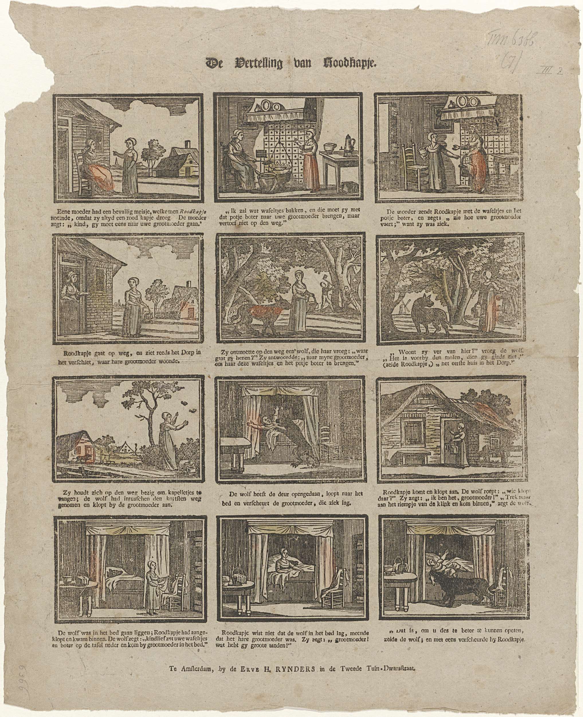 Blad met twaalf voorstellingen van het sprookje van Roodkapje. Onder elk plaatje een twee- of drieregelig versje. Ongenummerd. Ca. 1830-1855.