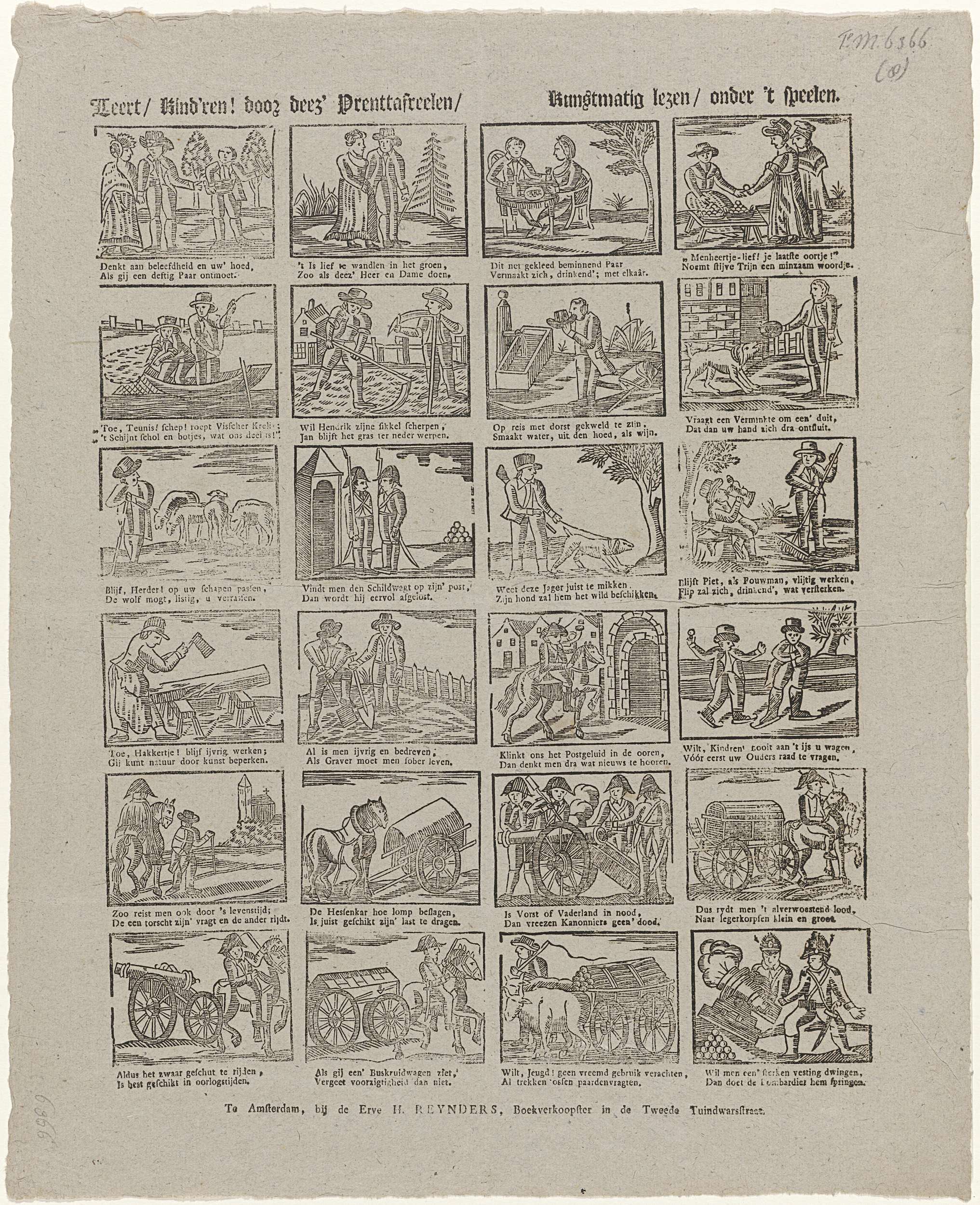 Blad met 24 voorstellingen van verschillende bezigheden. Onder elk plaatje een tweeregelig versje. Ongenummerd. Ca. 1830-1855.