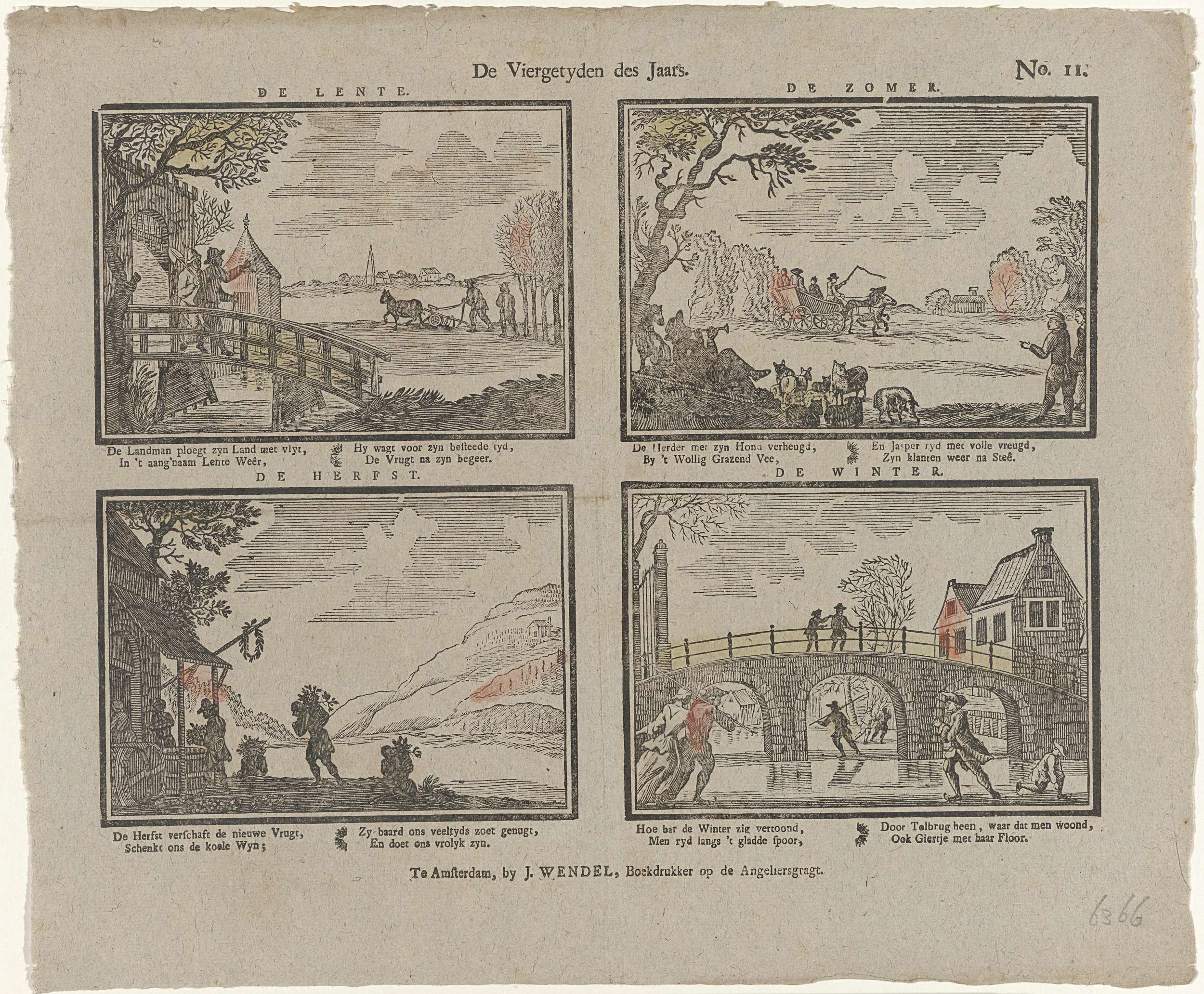 Blad met vier voorstellingen van de vier jaargetijden. Onder elk plaatje een vierregelig versje. Genummerd rechtsboven: No. 11. Ca. 1800-1820.