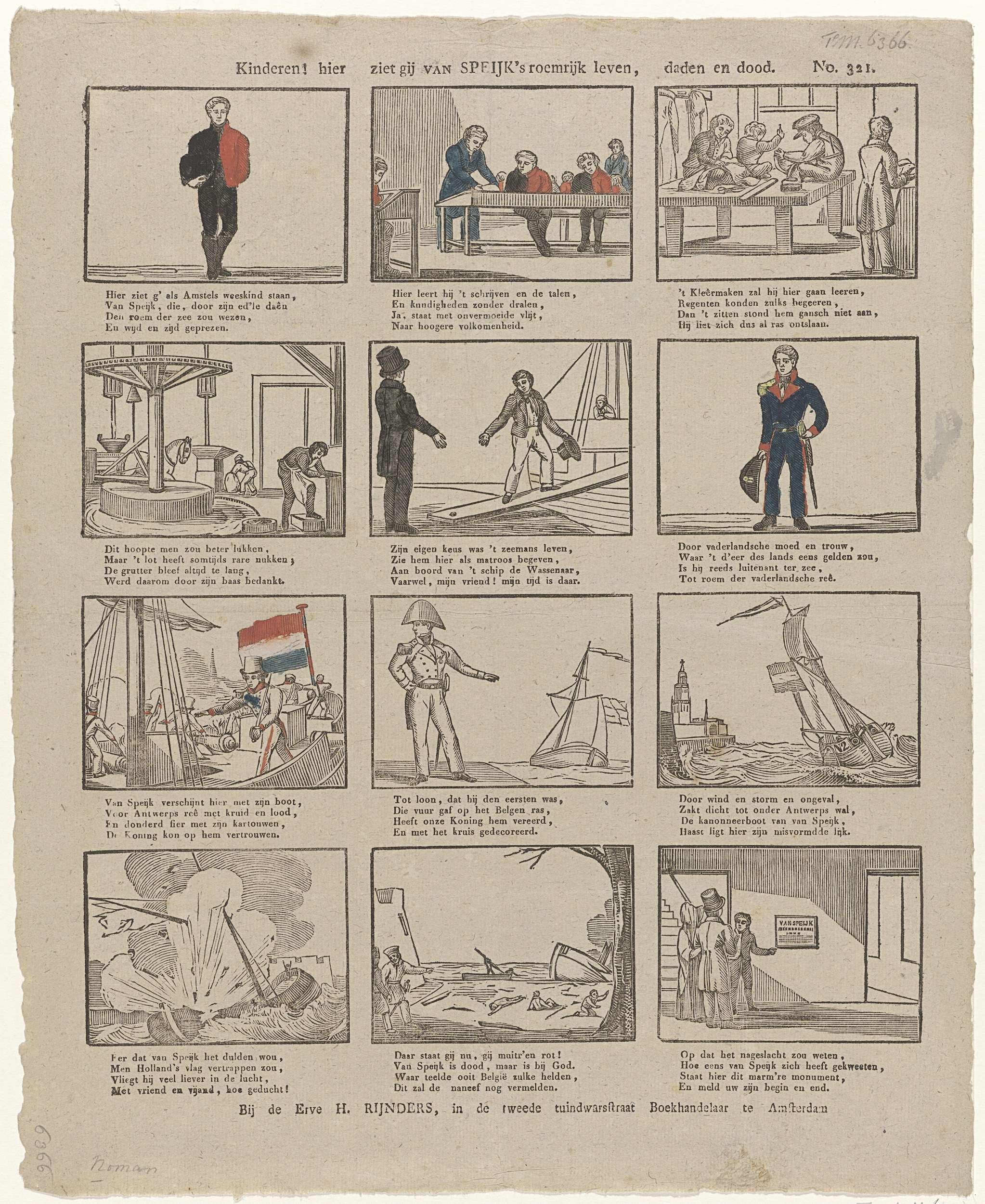 Blad met twaalf voorstellingen uit het leven van Jan van Speyk. Onder elk plaatje een vierregelig versje. Genummerd rechtsboven: No. 321. Ca. 1830-1855.