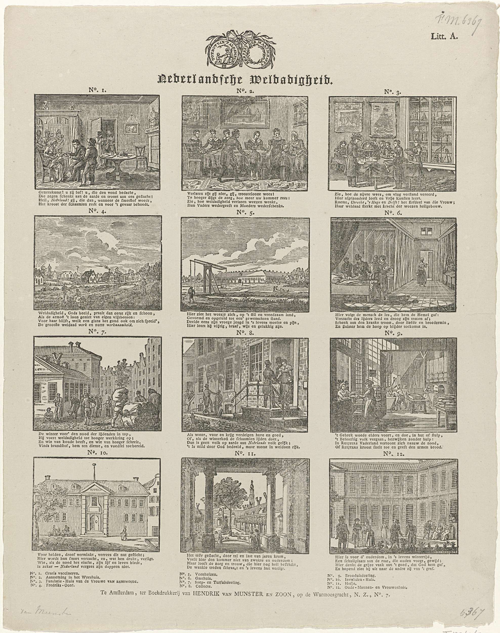 Blad met twaalf voorstellingen van liefdadigheidswerk in Nederland. De plaatjes genummerd 1-12. Onder elk plaatje een vierregelig versje. Voorzien van het zegel van de Maatschappij Tot Nut van 't Algemeen. Genummerd rechtsboven: Litt. A. Ca. 1840-1900.
