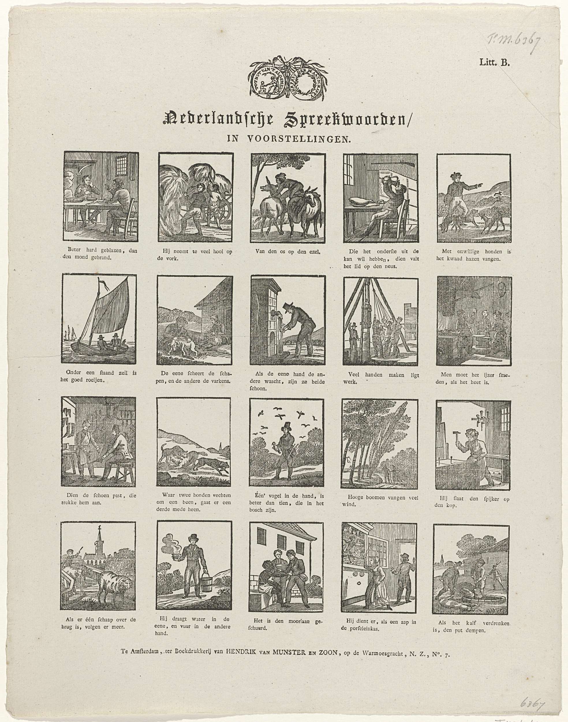 Blad met twintig voorstellingen van Nederlandse spreekwoorden. Onder elk plaatje het spreekwoord. Voorzien van het zegel van de Maatschappij Tot Nut van 't Algemeen. Genummerd rechtsboven: Litt. B. Ca. 1840-1900.