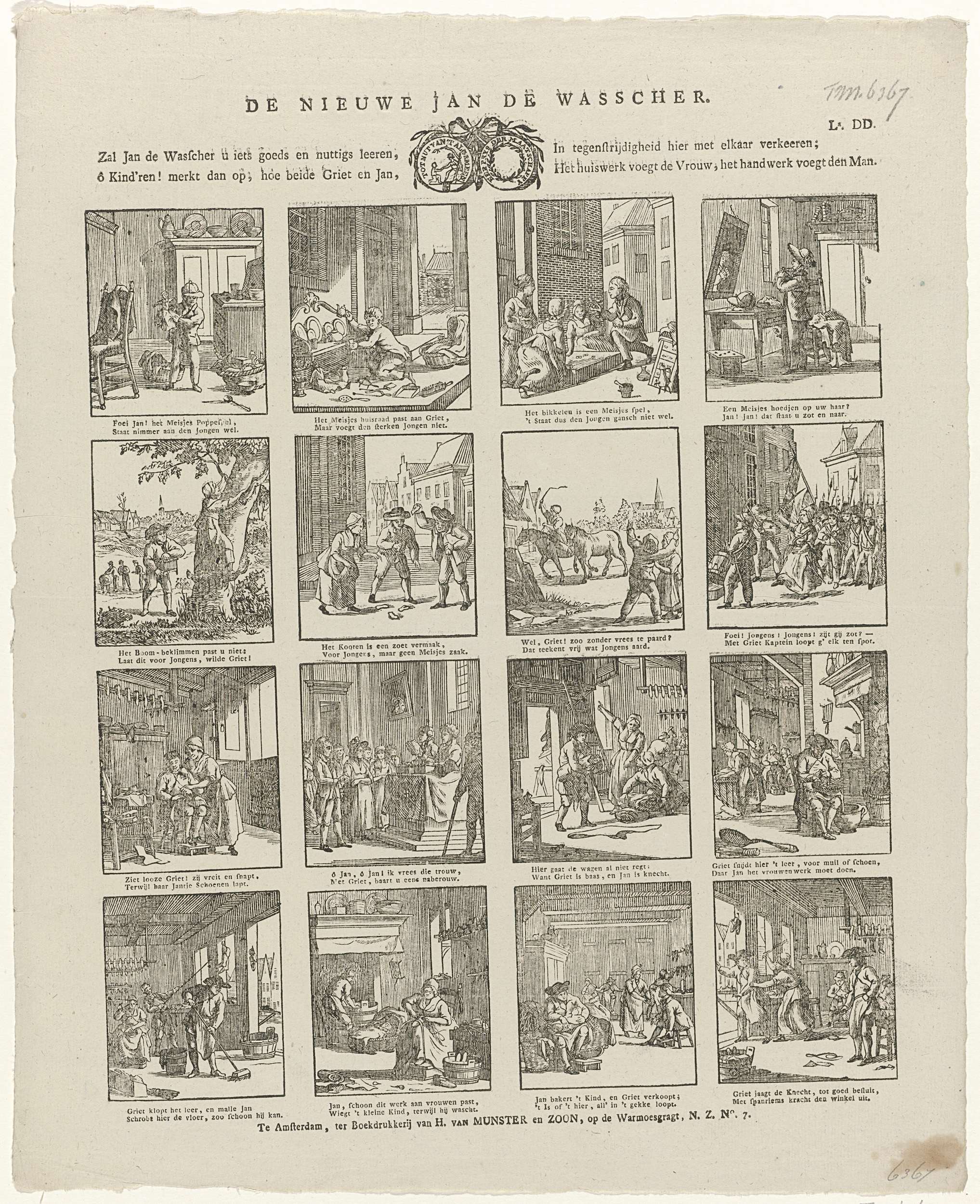 Blad met zestien voorstellingen van het leven van Jan de Wasscher, een man die van zijn vrouw - die de broek aan heeft - al het huishoudelijk werk moet doen. Onder elk plaatje een tweeregelig versje. Voorzien van het zegel van de Maatschappij Tot Nut van 't Algemeen. Genummerd rechtsboven: La. DD. Ca. 1840-1900.