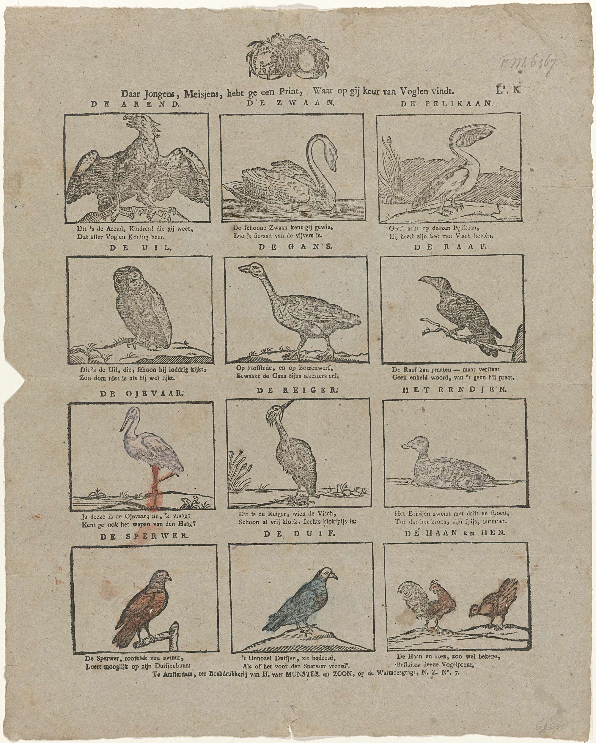 Blad met twaalf voorstellingen van vogels. Boven elk plaatje de naam van de vogel en eronder een tweeregelig versje. Voorzien van het zegel van de Maatschappij Tot Nut van 't Algemeen. Genummerd rechtsboven: La. K. Ca. 1840-1900.