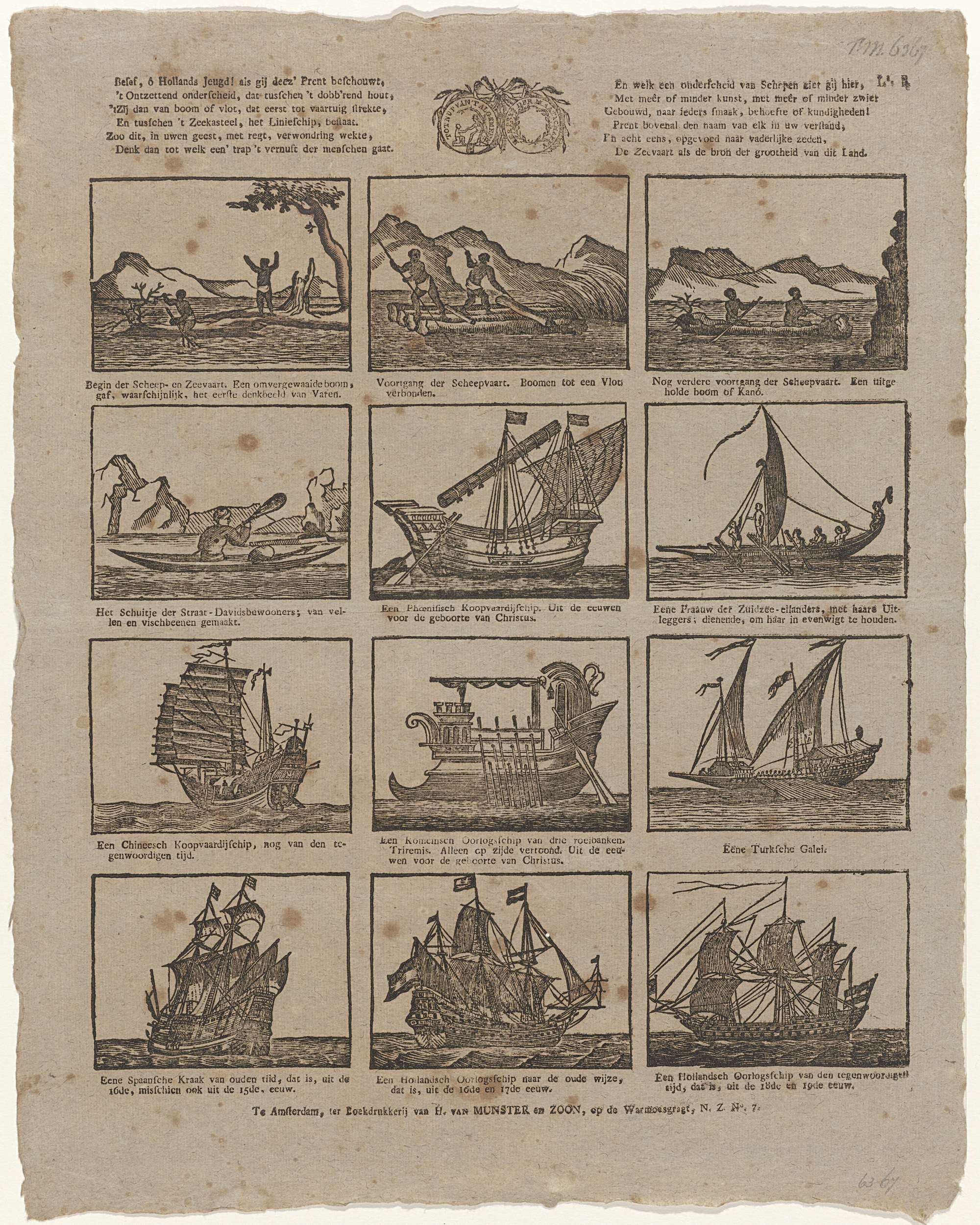 Blad met twaalf voorstellingen van de ontwikkeling van het vaartuig, van primitieve boomstam tot tegenwoordig Hollands oorlogsschip. Onder elk plaatje een onderschrift van twee of drie regels. Voorzien van het zegel van de Maatschappij Tot Nut van 't Algemeen. Genummerd rechtsboven: La. R. Ca. 1840-1900.