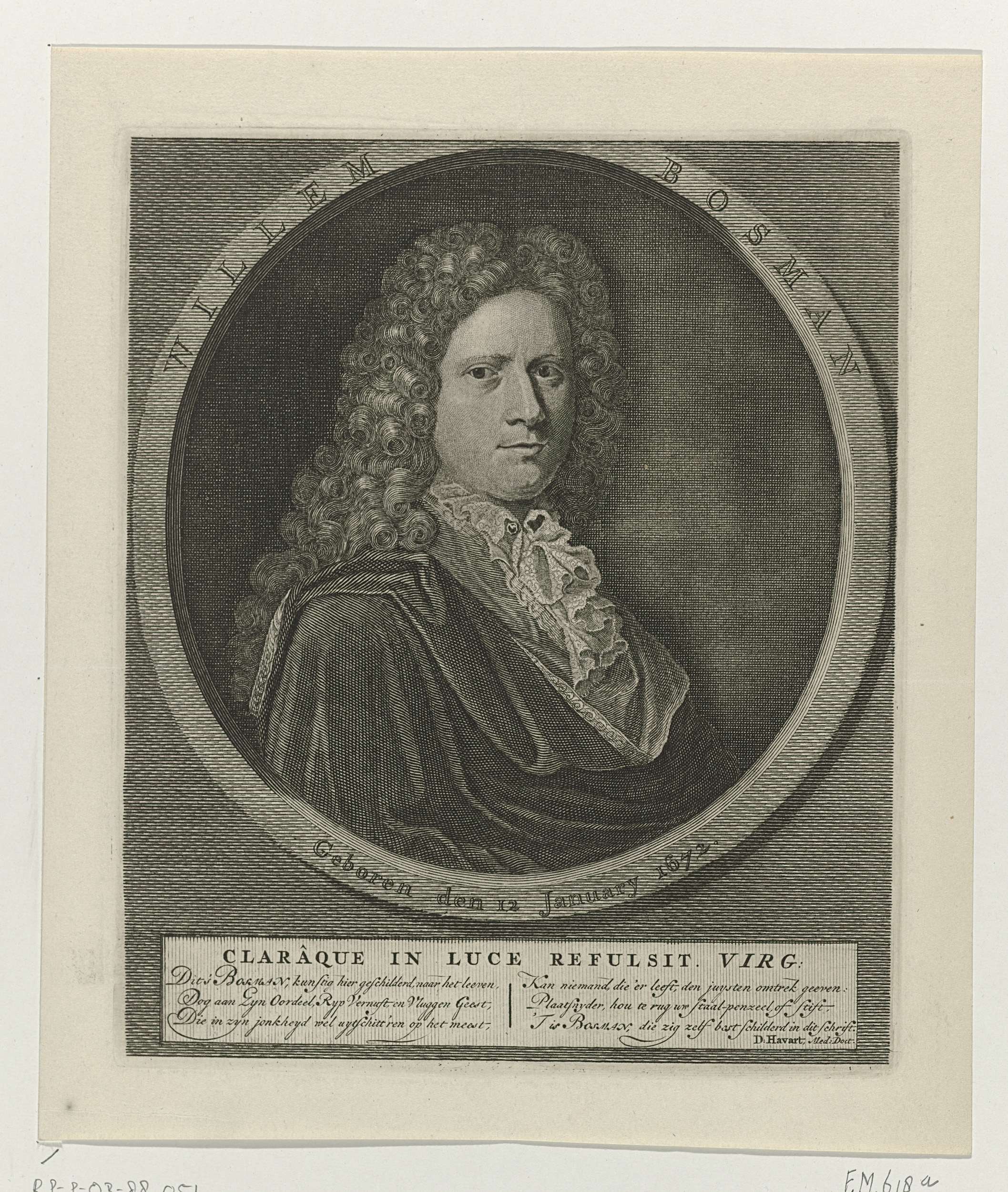 Portret van Willem Bosman, opperkoopman in dienst van de WIC in Guinea. Buste binnen ovaal. Onderaan een zesregelig vers.