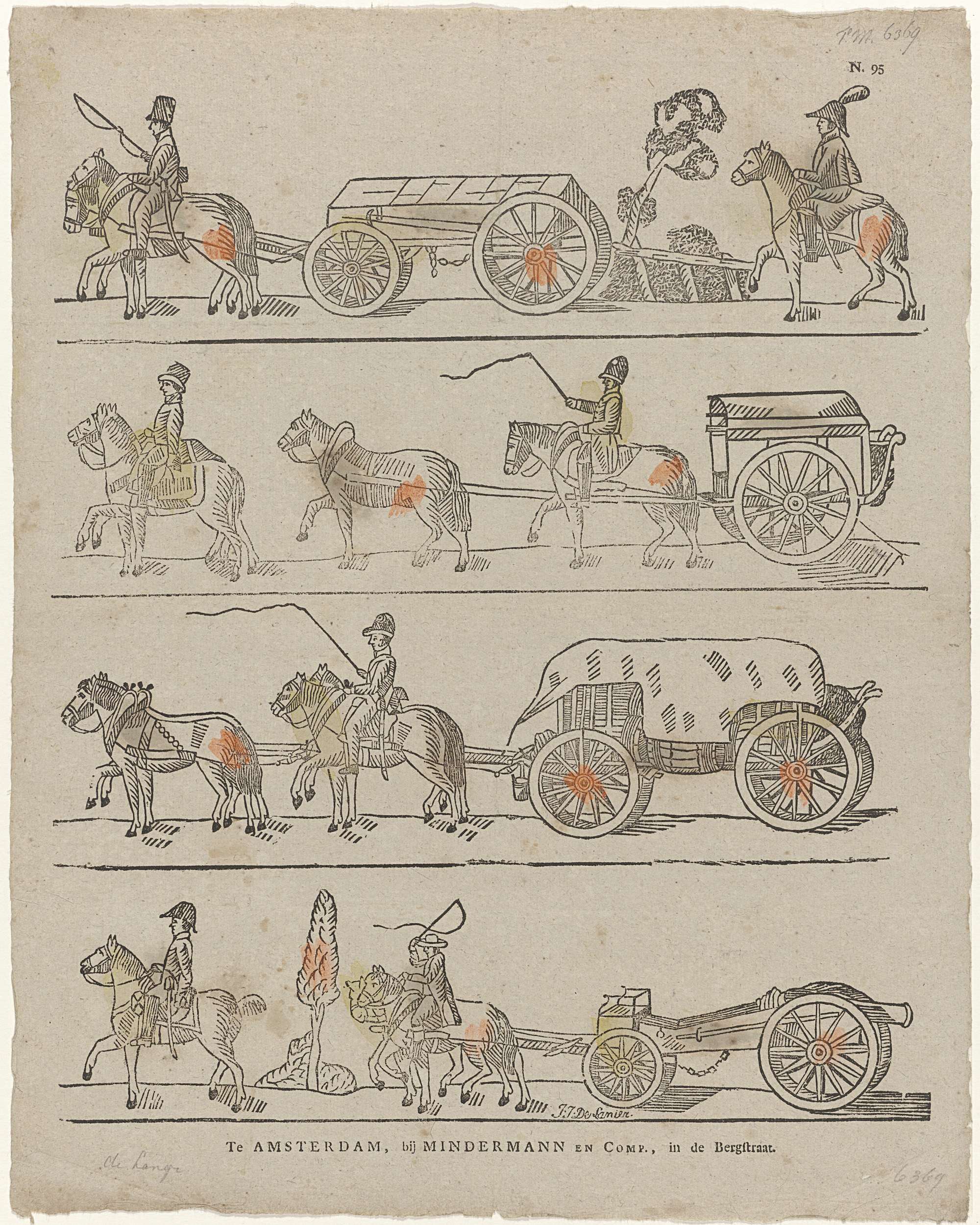 Blad met vier voorstellingen van de onderdelen van een legertrein. Zonder titel of teksten. Genummerd rechtsboven: N. 95. Ca. 1815-1850.