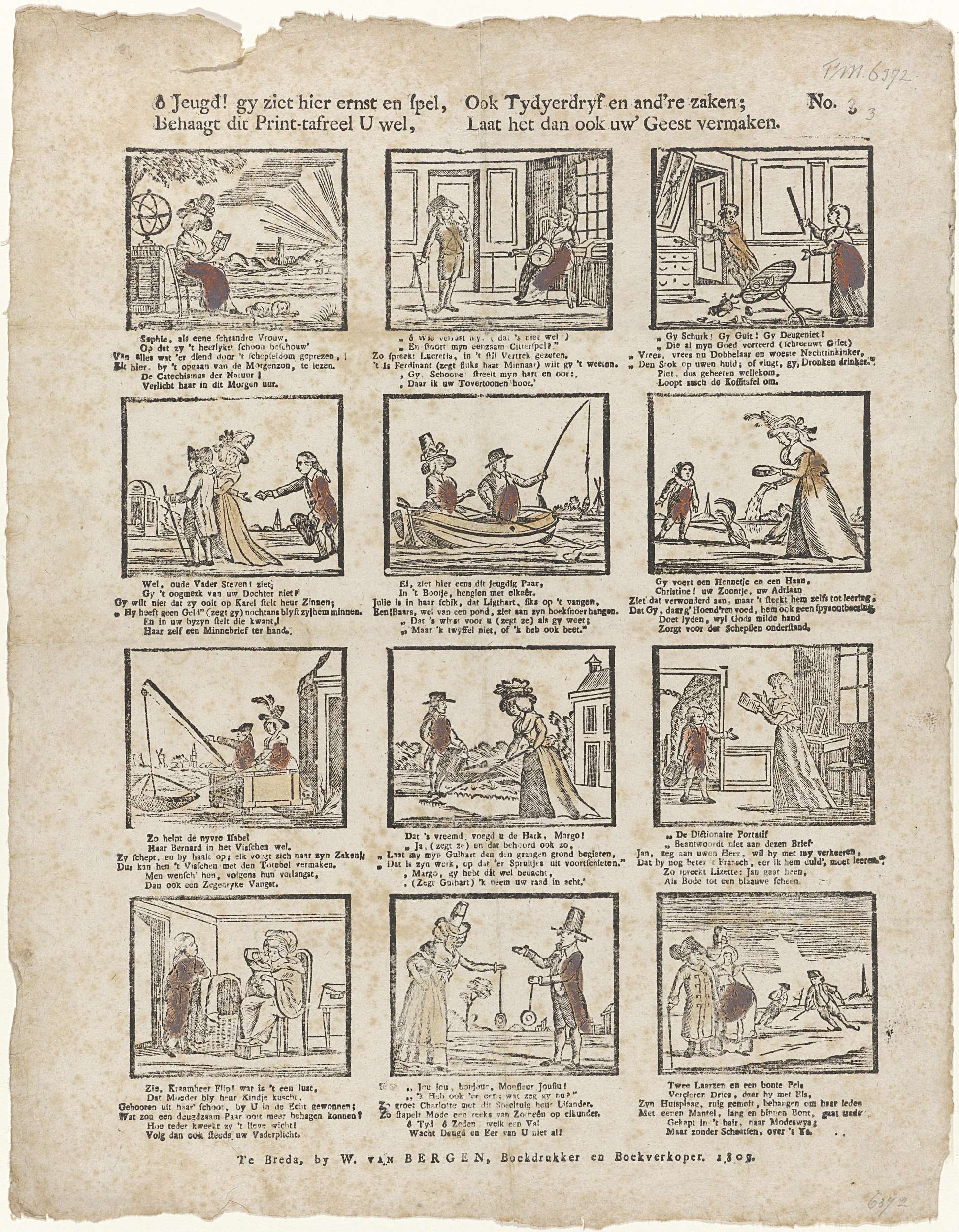 Blad met twaalf voorstellingen van allerlei vermaken. Onder elk plaatje een zesregelig versje. Genummerd rechtsboven: No. 3. 1809.