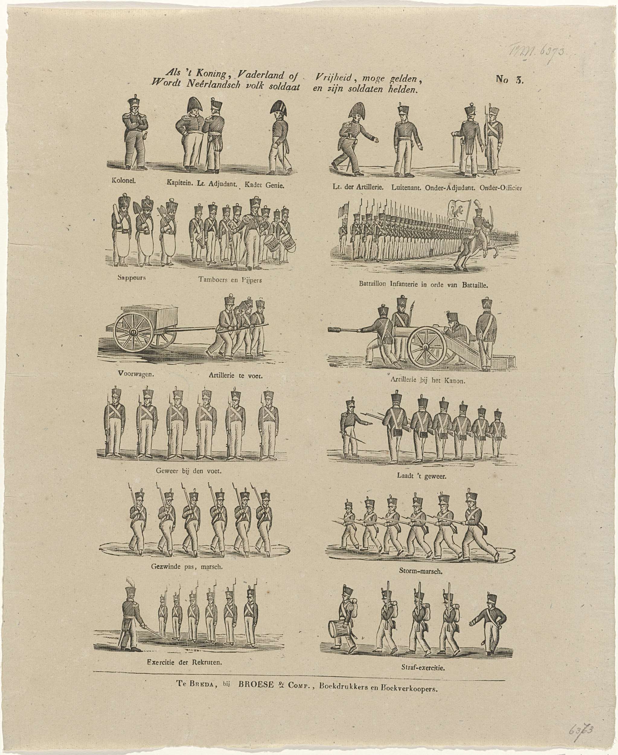 Blad met twaalf voorstellingen van Nederlandse militairen, rangen en exercities, ca. 1830-1831. Waarschijnlijk gerelateerd aan de Belgische Revoluitie. Onder elk plaatje een onderschrift. Genummerd rechtsboven: No. 3.