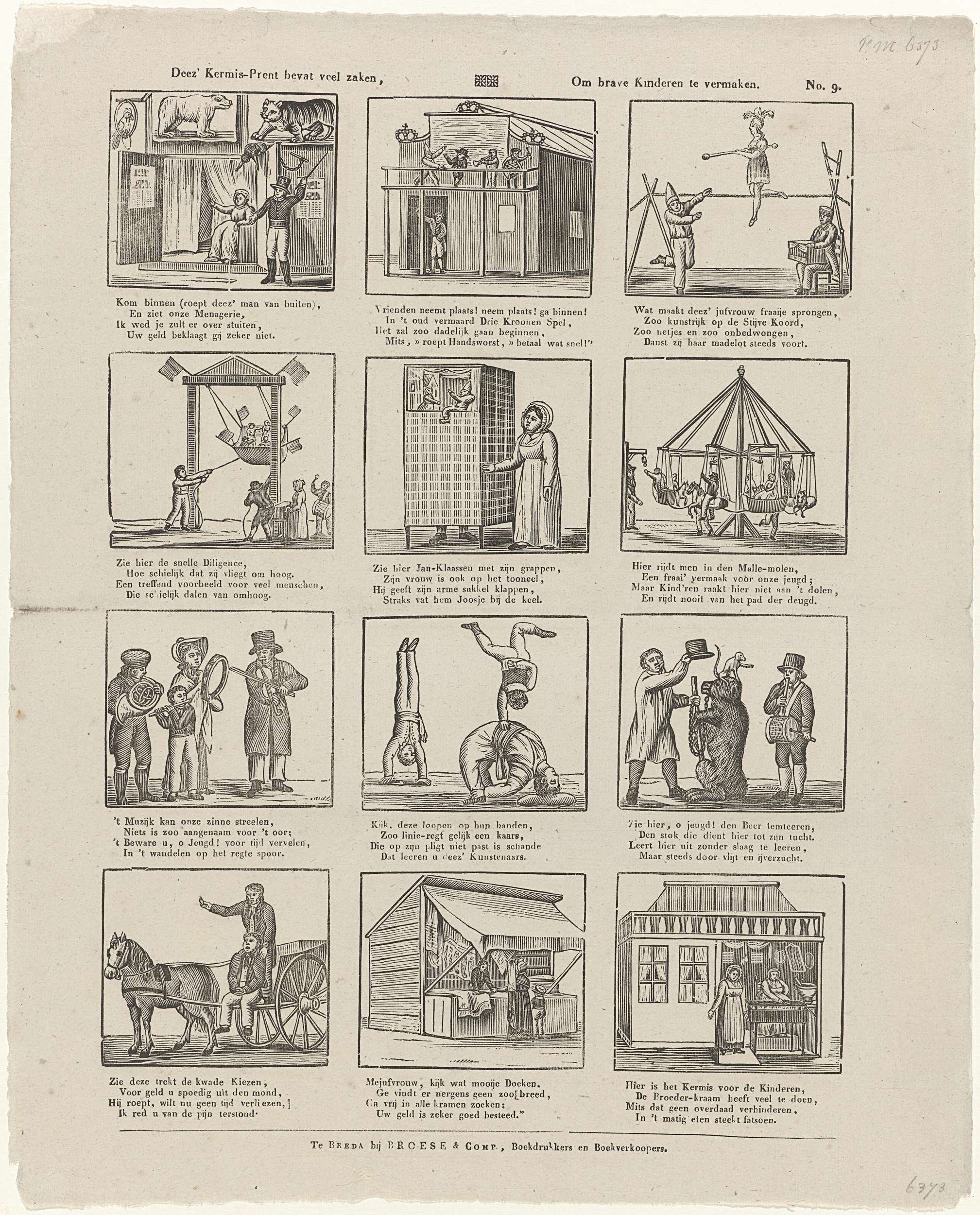 Kermisprent, blad met twaalf voorstellingen van kermisvermaak. Onder elk plaatje een vierregelig versje. Genummerd rechtsboven: No. 9. Ca. 1828-1850.