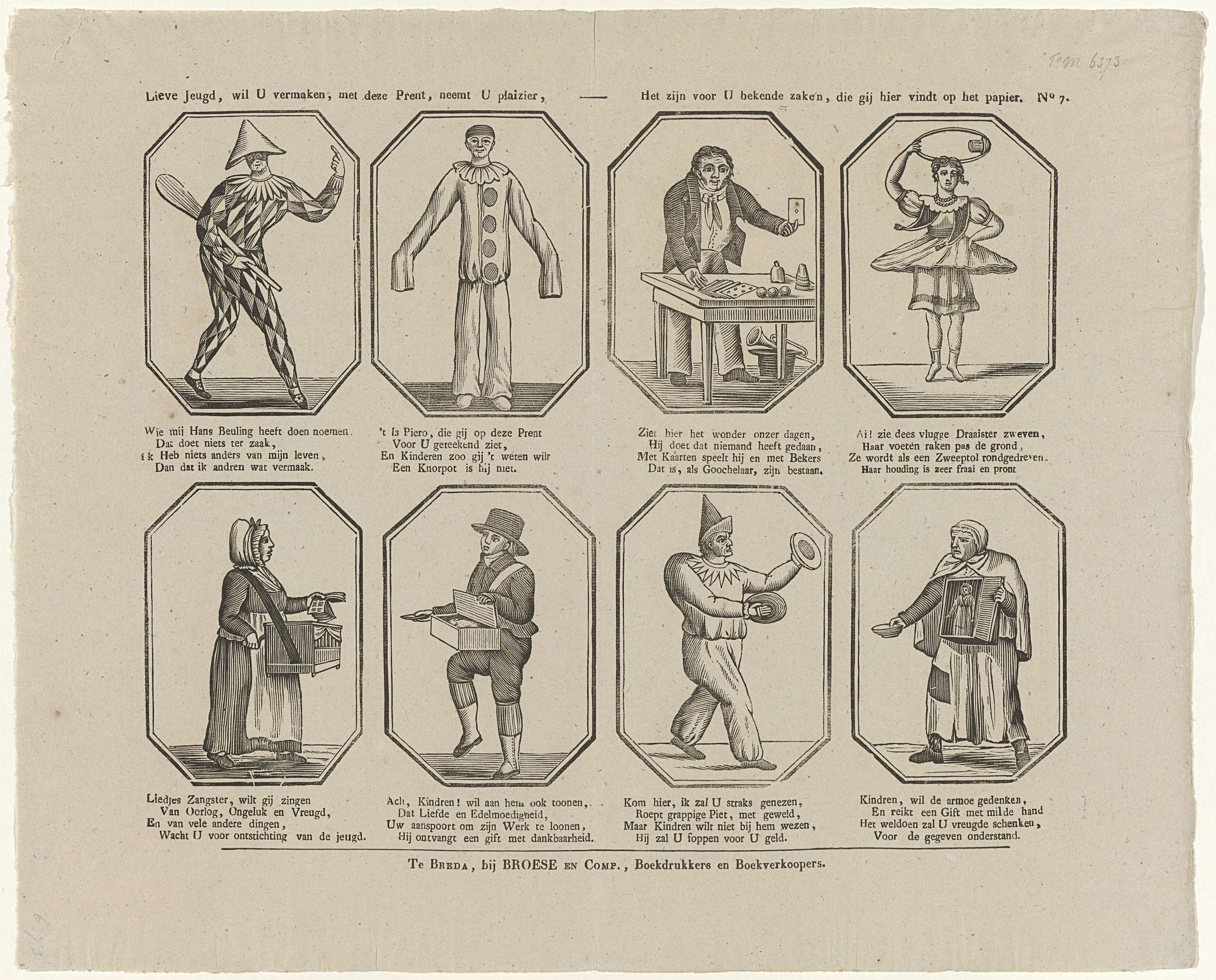 Blad met acht voorstellingen van circusartiesten en straatventers (onder andere een goochelaar, straatzangeres en vrouw met kijkdoos). Onder elk plaatje een vierregelig versje. Genummerd rechtsboven: No. 7. Ca. 1828-1850.