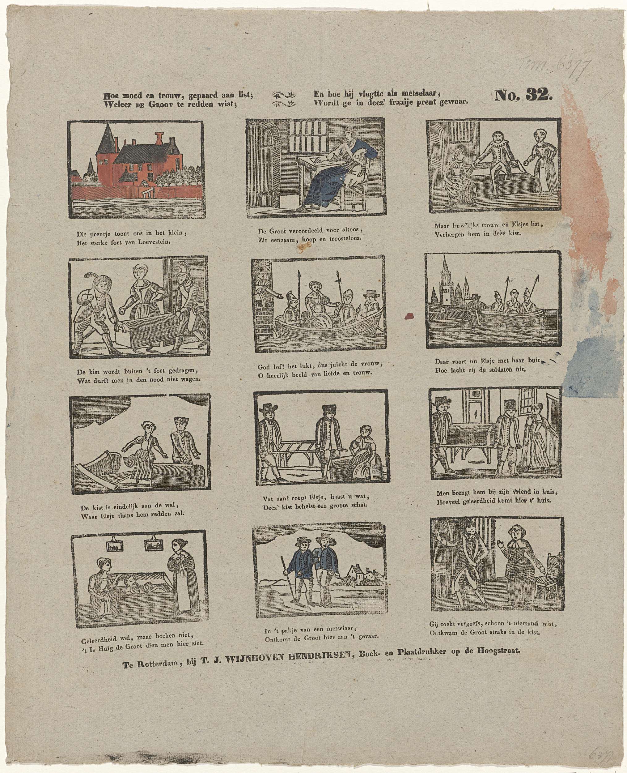 Blad met twaalf voorstellingen van de ontsnapping van Hugo de Groot uit Slot Loevestein in 1621. Onder elk plaatje een tweeregelig versje. Genummerd rechtsboven: No. 32. Ca. 1832-1849.