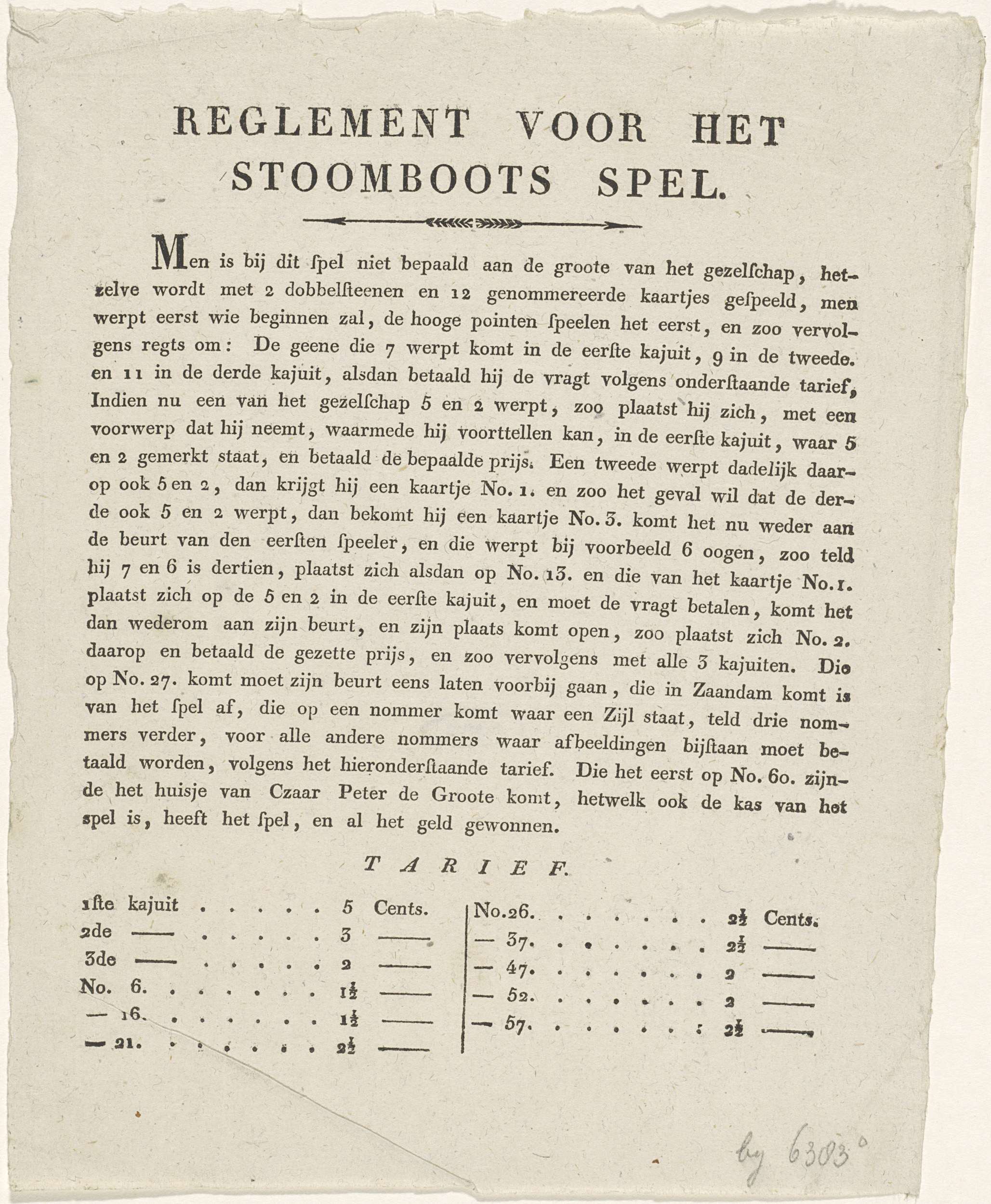 Tekstblad met de spelregels voor het bordspel genaamd Stoombootspel. Onderaan een overzicht van de tarieven. Onderdeel van een groep van kinder- en gezelschapsspelen gedrukt in de periode ca. 1750-1850.