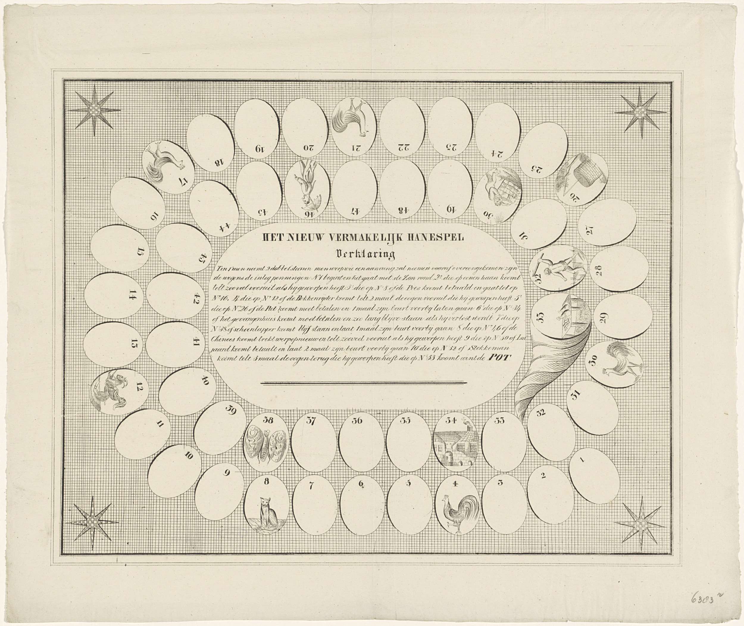 Bordspel genaamd Hanespel. Soort ganzenbord met dan met hanen. Centraal de spelregels. Onderdeel van een groep van kinder- en gezelschapsspelen gedrukt in de periode ca. 1750-1850.