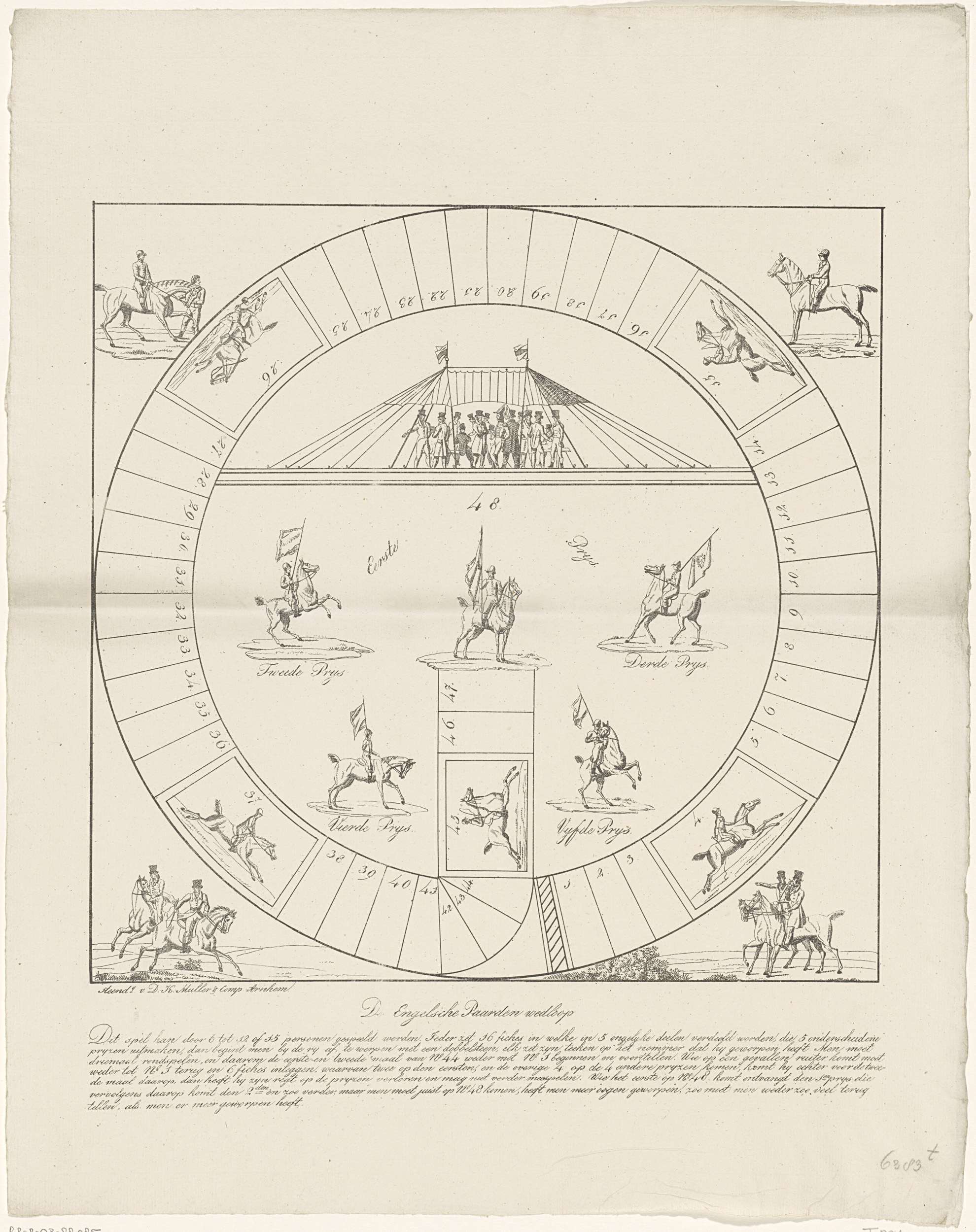 Bordspel genaamd De Engelsche Paarden wedloop, ca. 1835. Cirkelvormige renbaan met vakjes genummerd 1-48. Met afbeeldingen van paarden in een paardenrace, toeschouwers onder een tent en verschillende paarden met hun berijders. Onderdeel van een groep van kinder- en gezelschapsspelen gedrukt in de periode ca. 1750-1850.