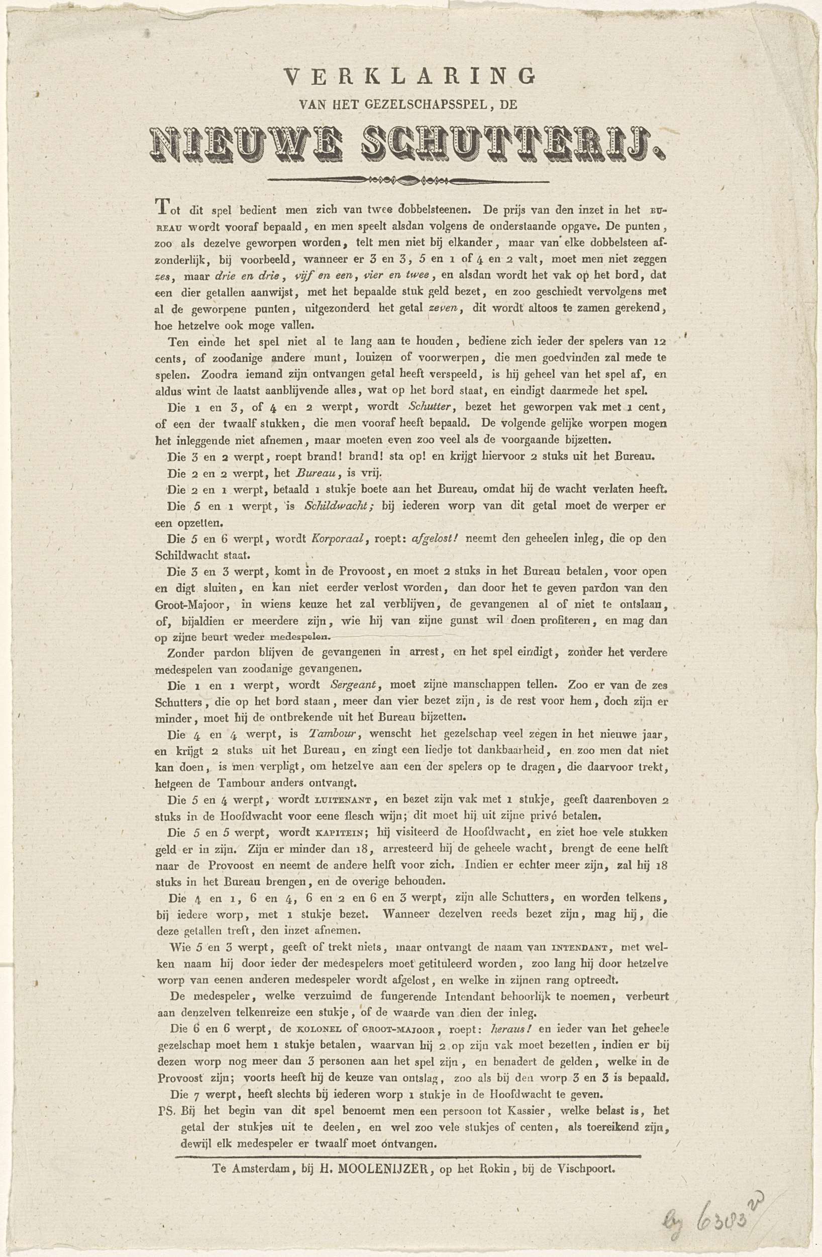 Tekstblad met de spelregels voor het schutterijspel. Onderdeel van een groep van kinder- en gezelschapsspelen gedrukt in de periode ca. 1750-1850.