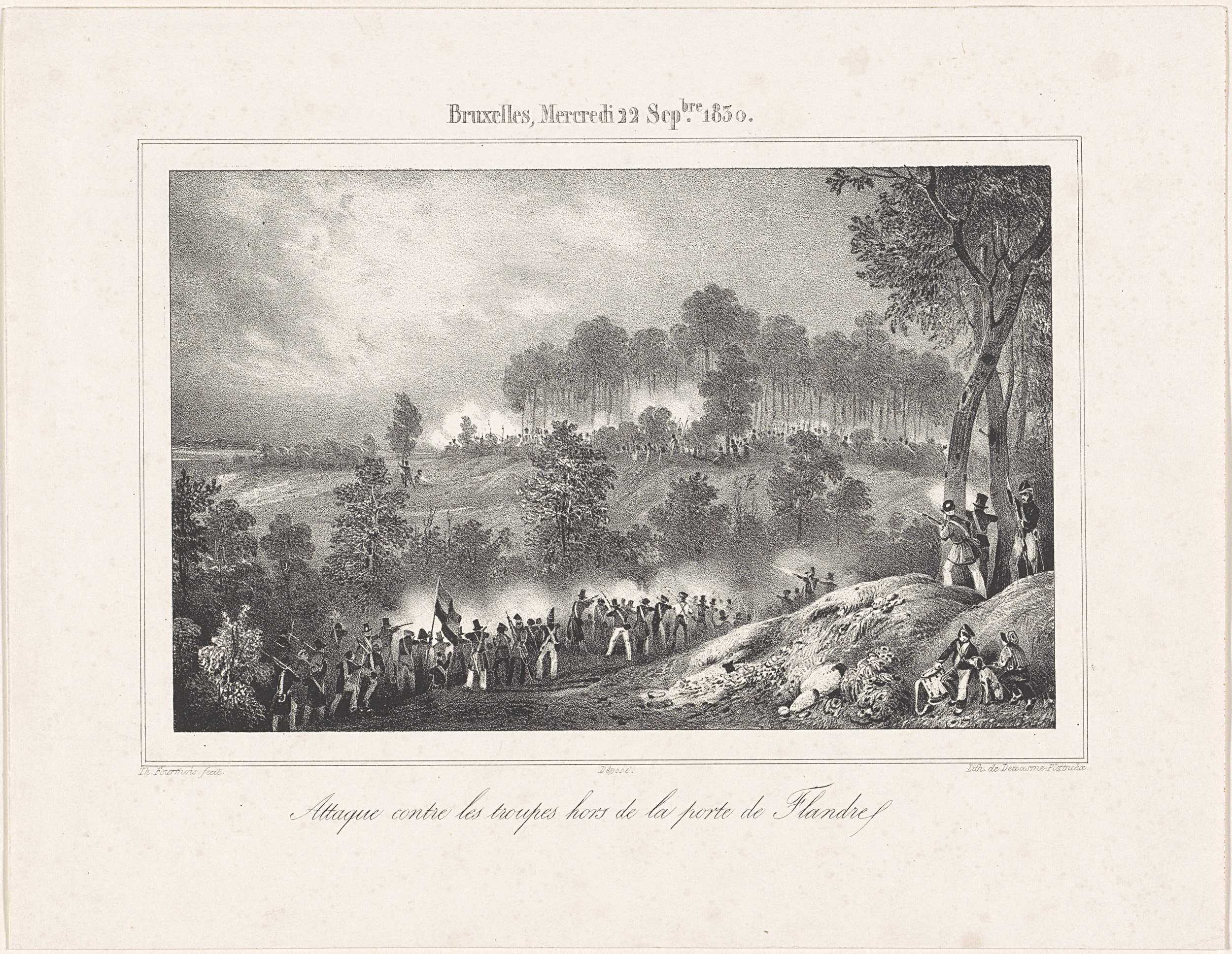 Gevechten tussen Nederlandse en Belgische troepen buiten Brussel, bij de stadspoort Porte de Flandre (Vlaamsepoort), 22 september 1830. Onderdeel van een recueil met platen over de gebeurtenissen tijdens de Belgische Revolutie in Brussel, Antwerpen en andere steden in de periode 25 augustus 1830 tot 27 maart 1831.