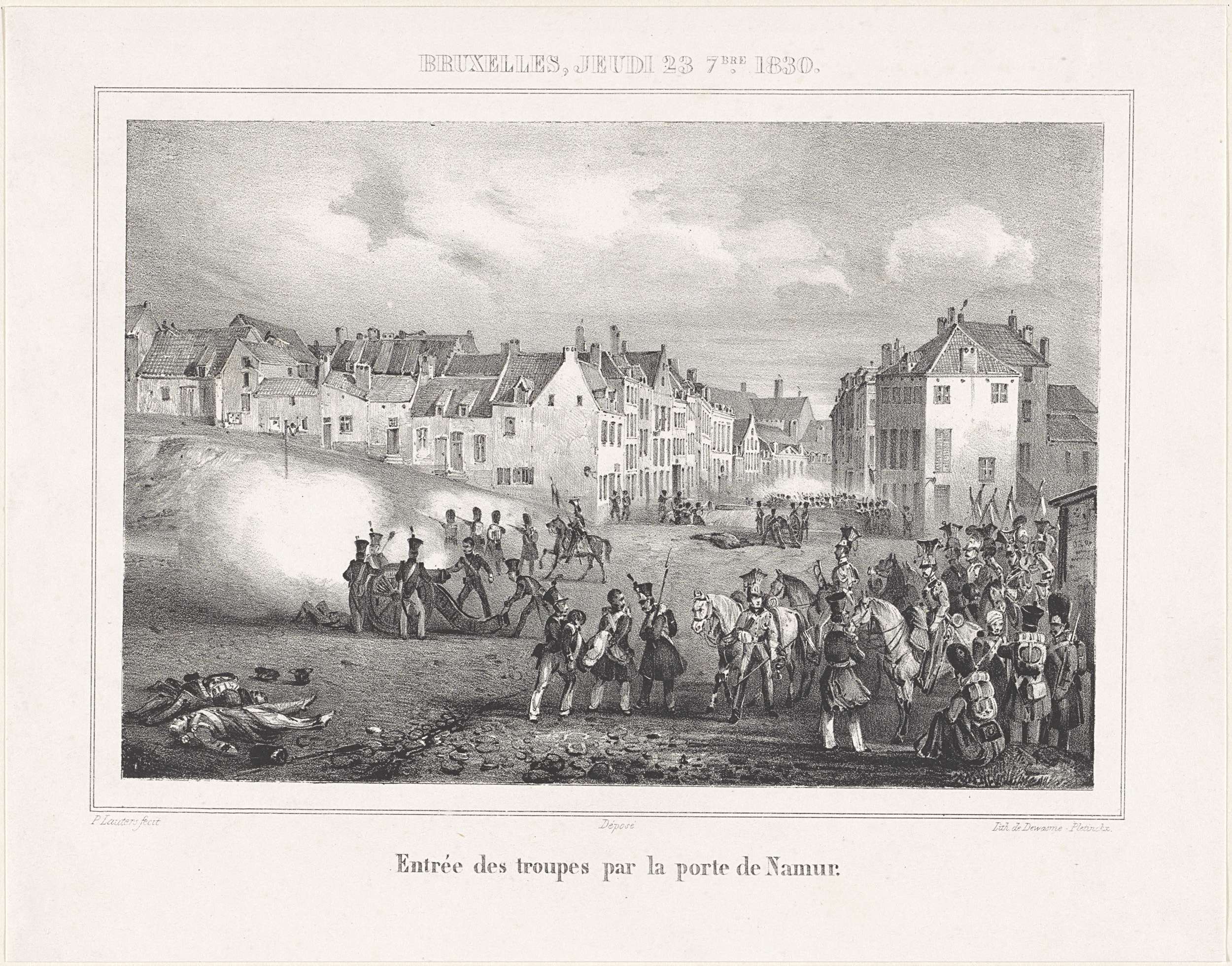 Nederlandse troepen trekken via de Porte de Namur (Naamsepoort) Brussel binnen, 23 september 1830. Gevechten in de straat. Onderdeel van een recueil met platen over de gebeurtenissen tijdens de Belgische Revolutie in Brussel, Antwerpen en andere steden in de periode 25 augustus 1830 tot 27 maart 1831.