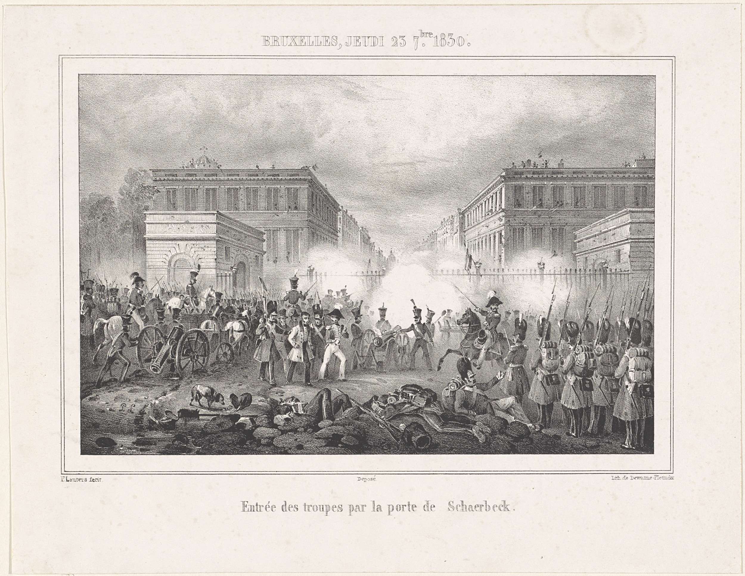 Nederlandse troepen trekken via de Porte de Schaarbeek (Schaarbeekse Poort) Brussel binnen, 23 september 1830. Gevechten in de straat. Onderdeel van een recueil met platen over de gebeurtenissen tijdens de Belgische Revolutie in Brussel, Antwerpen en andere steden in de periode 25 augustus 1830 tot 27 maart 1831.