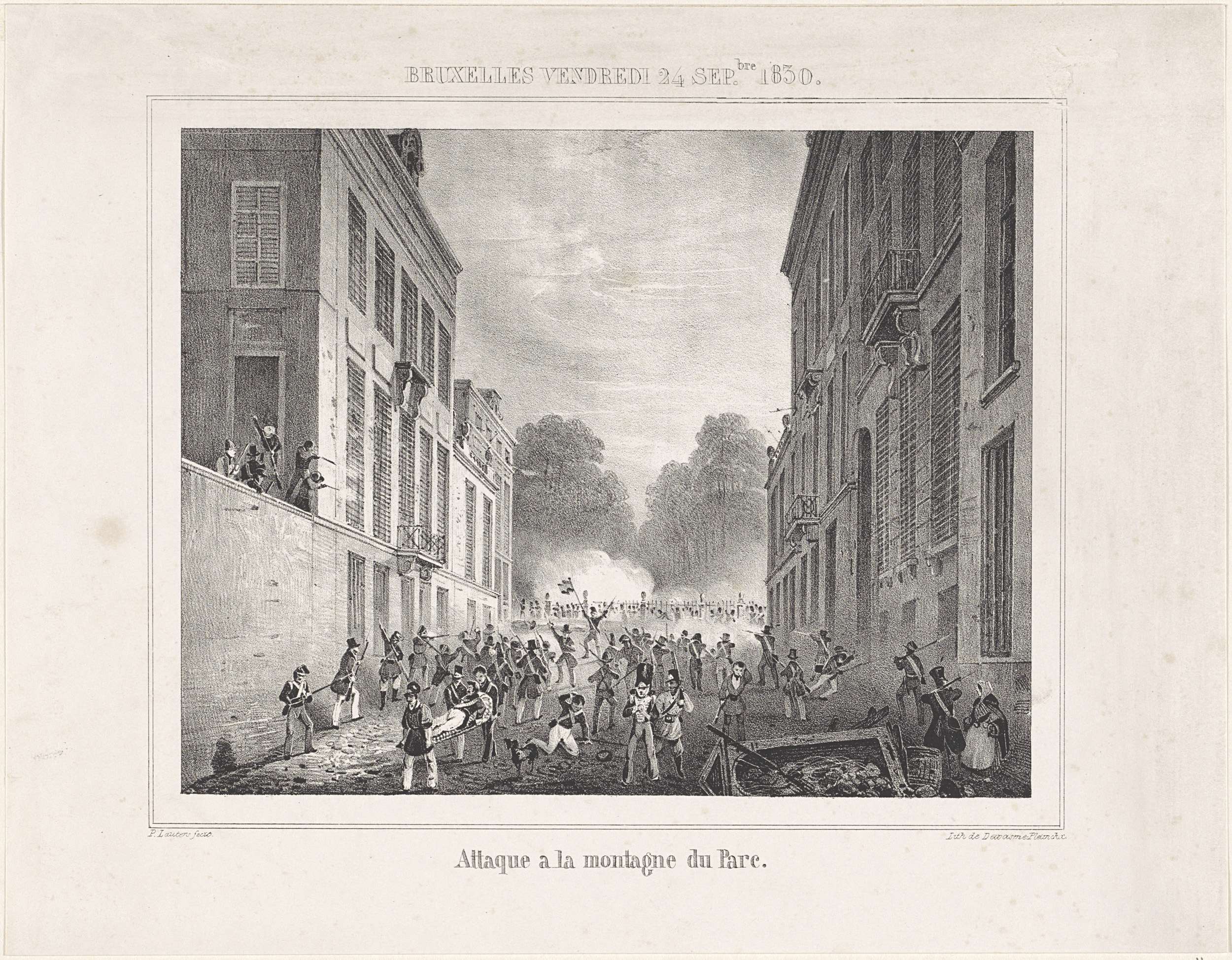 Aanval op de Nederlandse troepen opgesteld in het Parc Royal (Warandepark) in Brussel door Belgische opstandelingen op 24 september 1830. Onderdeel van een recueil met platen over de gebeurtenissen tijdens de Belgische Revolutie in Brussel, Antwerpen en andere steden in de periode 25 augustus 1830 tot 27 maart 1831.