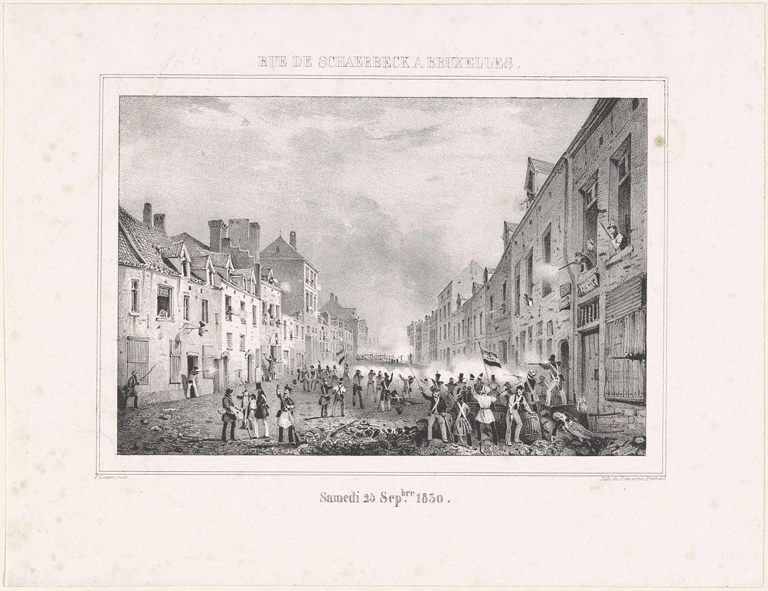 Gevechten tussen de Nederlandse troepen en Belgische opstandelingen in de Schaarbeekstraat te Brussel 25 september 1830. Onderdeel van een recueil met platen over de gebeurtenissen tijdens de Belgische Revolutie in Brussel, Antwerpen en andere steden in de periode 25 augustus 1830 tot 27 maart 1831.