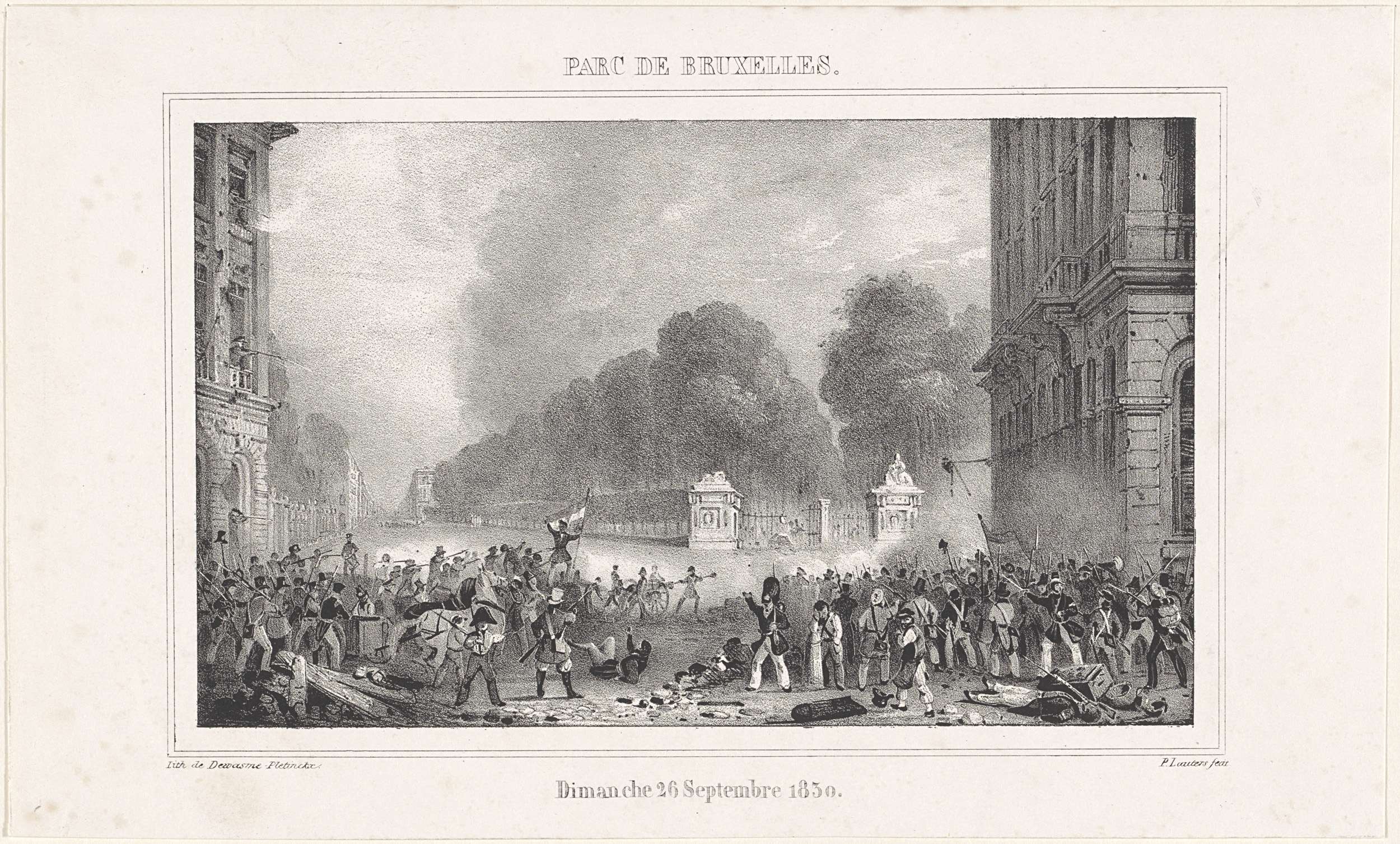 Gevechten tussen de Nederlandse troepen en Belgische opstandelingen bij het Warandepark in Brussel 26 september 1830. Onderdeel van een recueil met platen over de gebeurtenissen tijdens de Belgische Revolutie in Brussel, Antwerpen en andere steden in de periode 25 augustus 1830 tot 27 maart 1831.