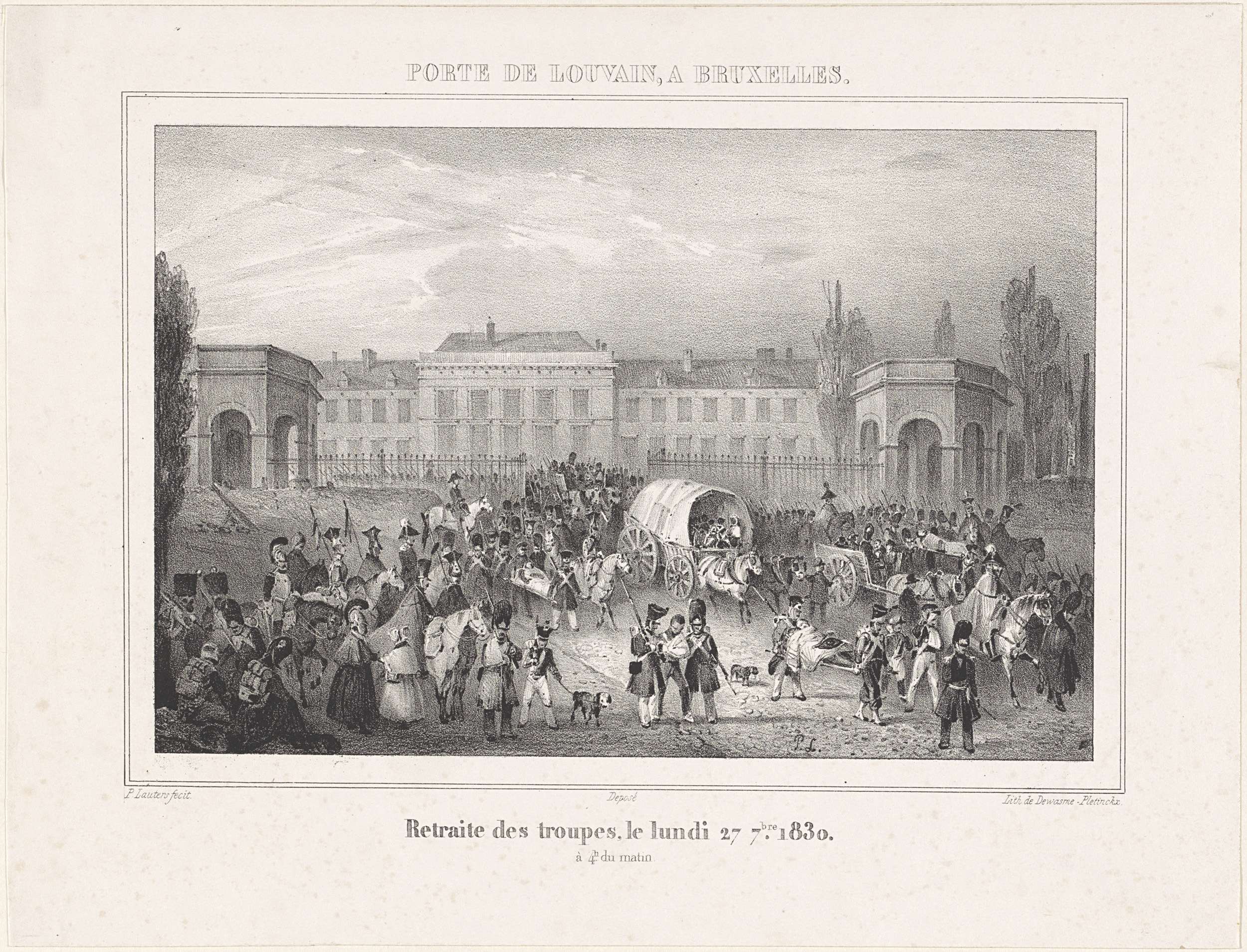 De Nederlandse troepen trekken zich terug uit Brussel en verlaten de stad door de Leuvensepoort op 27 september 1830. Onderdeel van een recueil met platen over de gebeurtenissen tijdens de Belgische Revolutie in Brussel, Antwerpen en andere steden in de periode 25 augustus 1830 tot 27 maart 1831.
