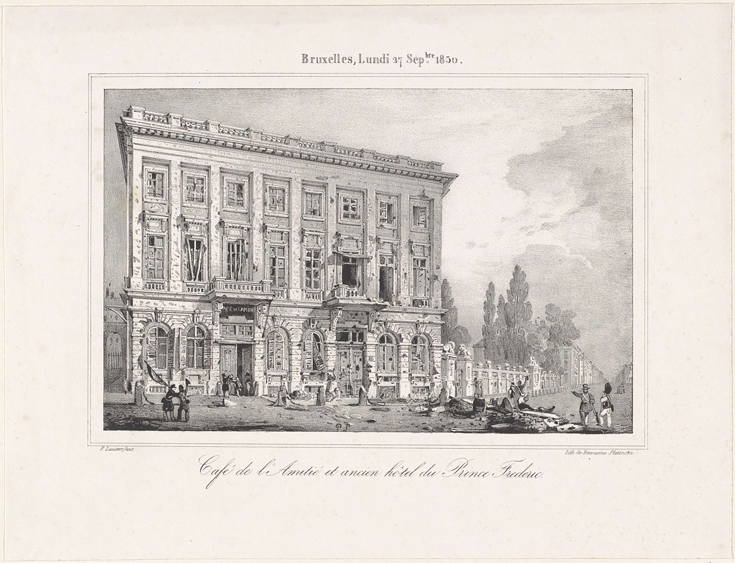 Het zwaar gehavende Café de l'Amitié (de verblijfplaats van Prins Frederik) aan het Koningsplein te Brussel, 27 september 1830. Onderdeel van een recueil met platen over de gebeurtenissen tijdens de Belgische Revolutie in Brussel, Antwerpen en andere steden in de periode 25 augustus 1830 tot 27 maart 1831.