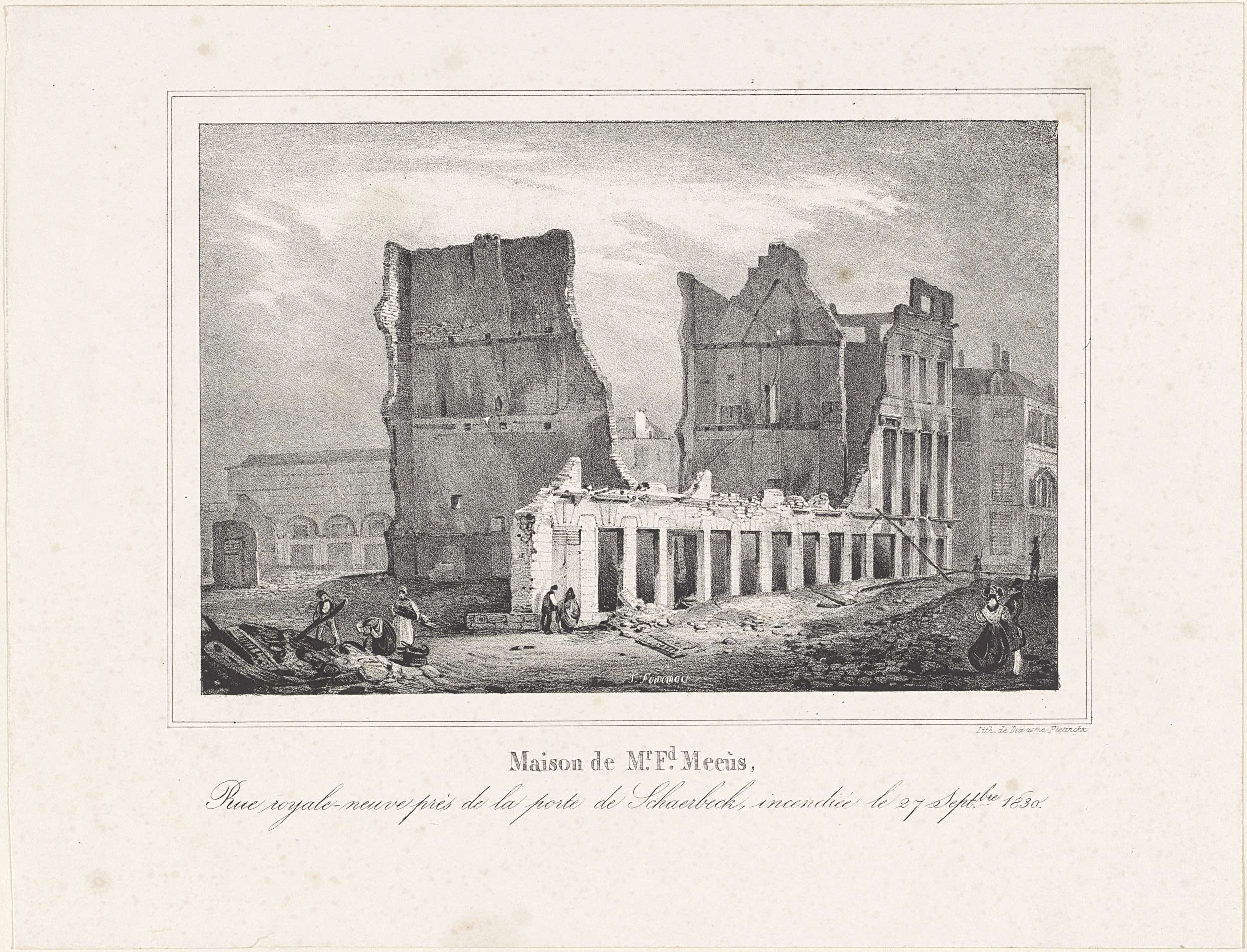 De ruïne van het uitgebrande huis van Mr. Ferdinand Meeûs nabij de Schaarbeekse Poort te Brussel, 27 september 1830. Onderdeel van een recueil met platen over de gebeurtenissen tijdens de Belgische Revolutie in Brussel, Antwerpen en andere steden in de periode 25 augustus 1830 tot 27 maart 1831.