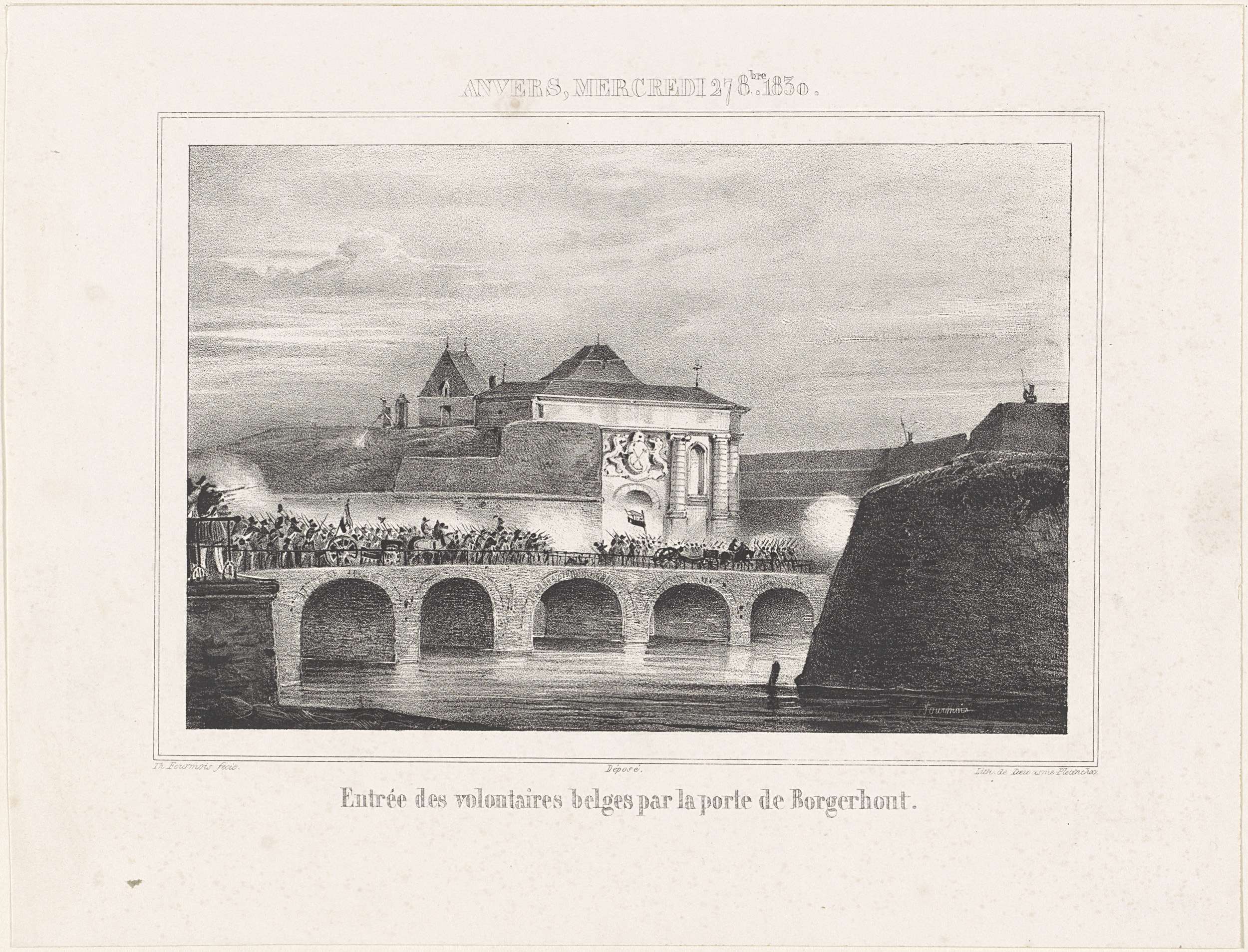 Legioen van Belgische vrijwilligers trekt via de Borgerhoutse Poort Antwerpen binnen, 27 oktober 1830. Onderdeel van een recueil met platen over de gebeurtenissen tijdens de Belgische Revolutie in Brussel, Antwerpen en andere steden in de periode 25 augustus 1830 tot 27 maart 1831.