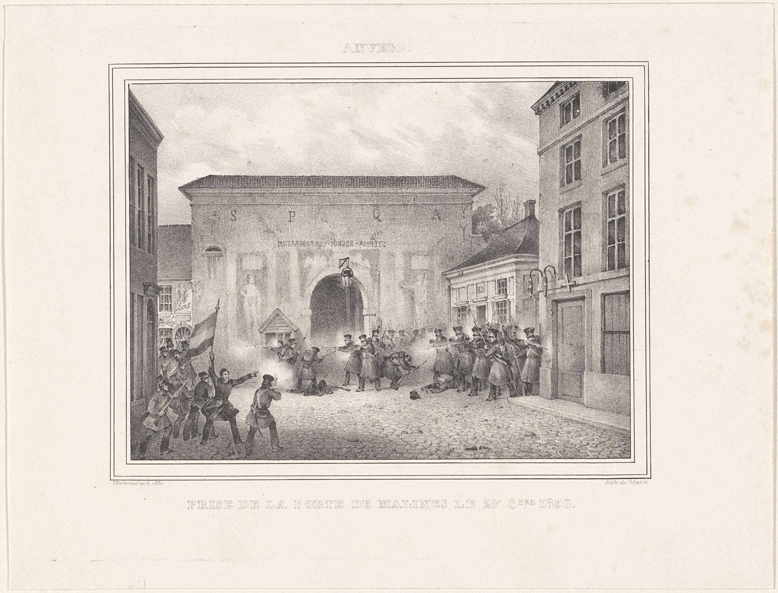 Legioen van Belgische vrijwilligers veroveren de Mechelsepoort te Antwerpen, 27 oktober 1830. Onderdeel van een groep van prenten afkomstig uit verschillende andere series maar toegevoegd aan het recueil over de gebeurtenissen tijdens de Belgische Revolutie in Brussel, Antwerpen en andere steden in de periode 25 augustus 1830 tot 27 maart 1831.