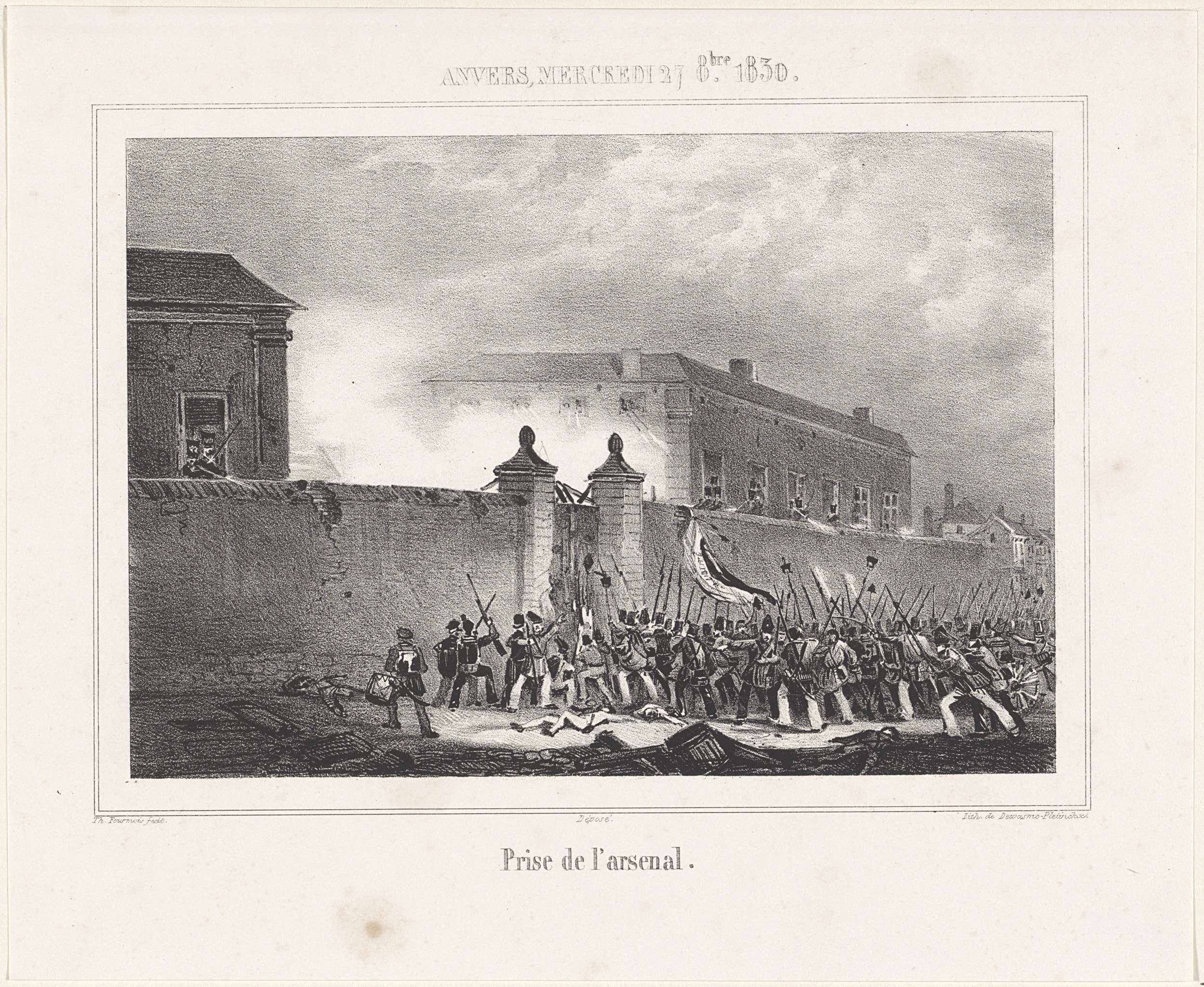 Belgische opstandelingen bestormen en veroveren het arsenaal in Antwerpen, 27 oktober 1830. Onderdeel van een recueil met platen over de gebeurtenissen tijdens de Belgische Revolutie in Brussel, Antwerpen en andere steden in de periode 25 augustus 1830 tot 27 maart 1831.