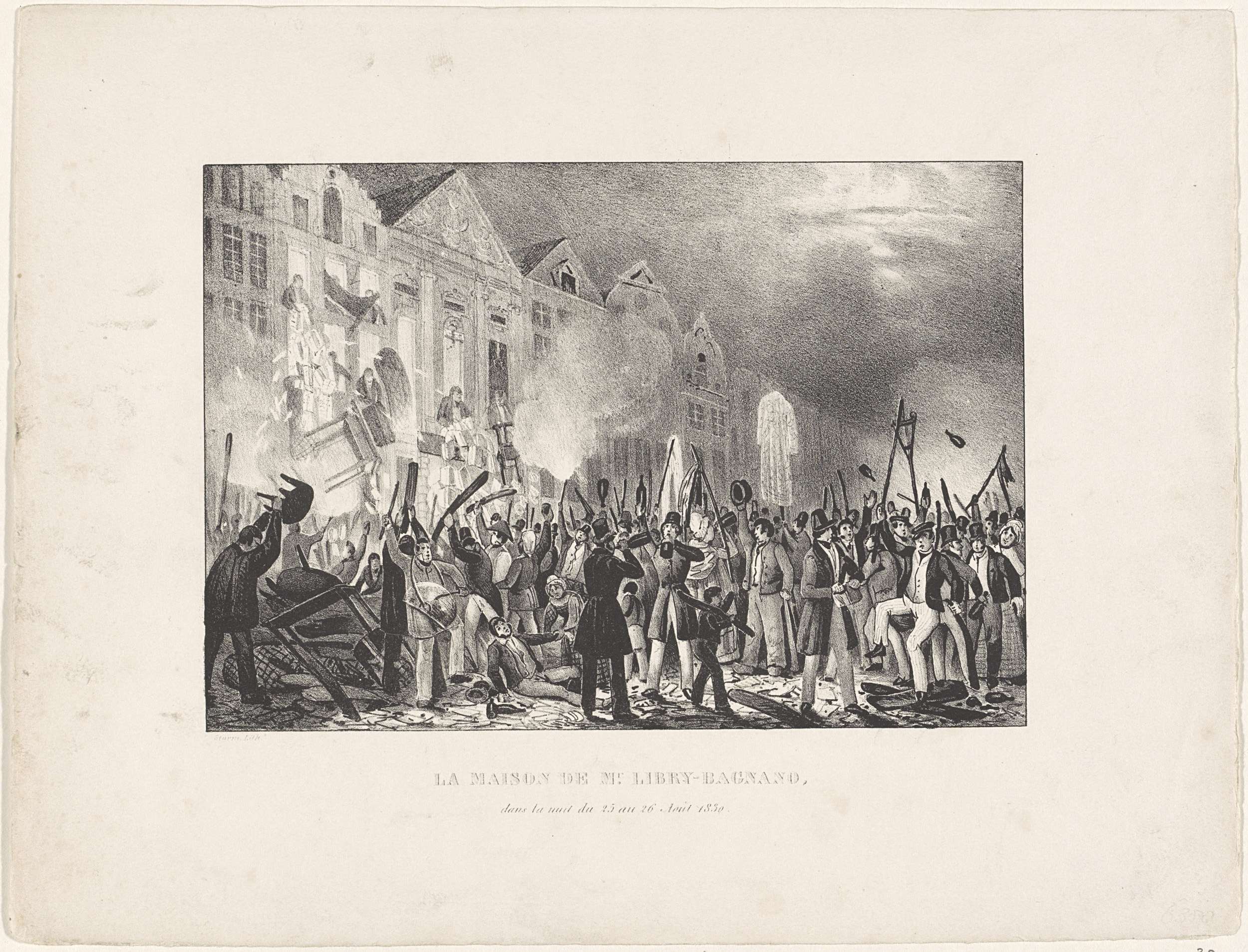 Plundering van het huis van de uitgever George Libry, graaf van Bagnano, te Brussel in de nacht van 25 op 26 augustus 1830. Onderdeel van een groep van prenten uit verschillende andere series verwant aan de platen in het recueil over de gebeurtenissen tijdens de Belgische Revolutie in Brussel, Antwerpen en andere steden in de ...